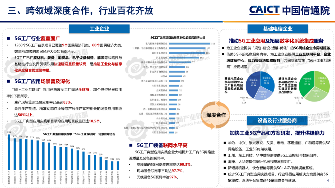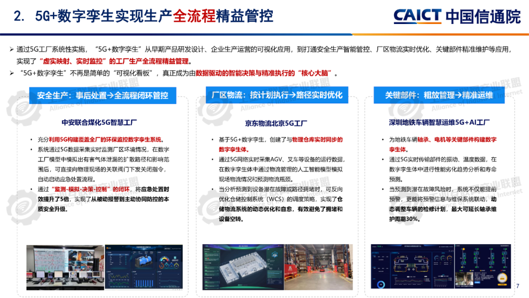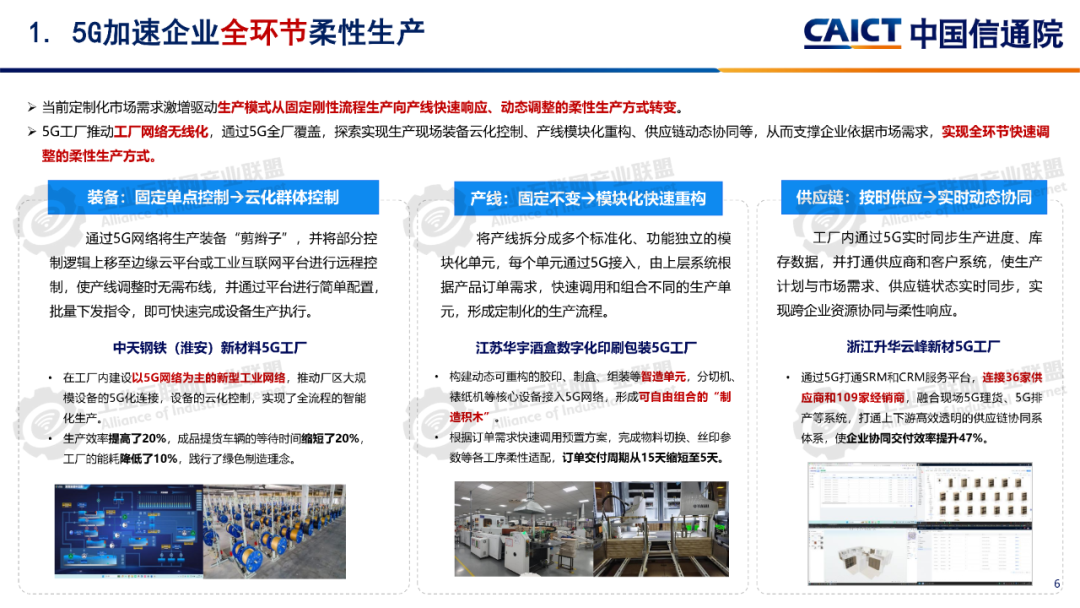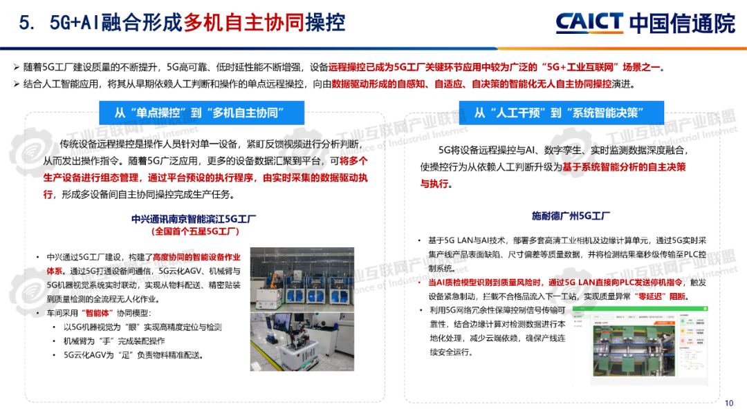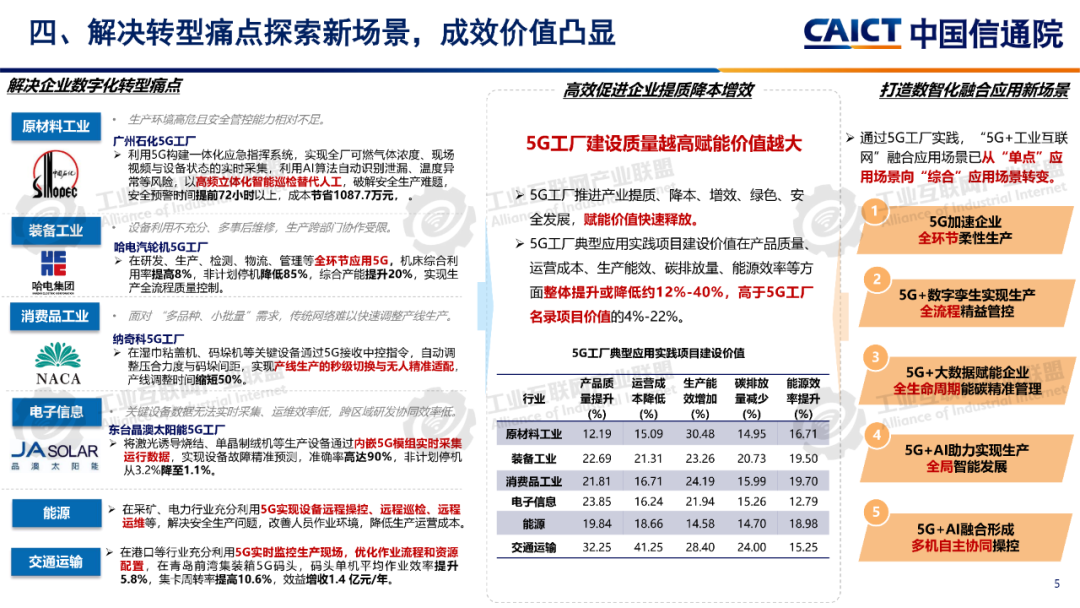 報告分析,12605G工廠名錄項目已覆蓋全國28個省(自治區、直轄市)、9個國民經濟門類、60個國民經濟大類。同時5G工廠作為推進工業和信息化深度融合的重要舉措,原材料工業、裝備工業、消費品工業、電子信息、能源交通等行業企業與基礎電信企業、設備及行業服務商深度合作,形成1005G工廠典型應用實踐,各工廠平均5G網絡覆蓋率高達99.3%、現場裝備聯網率高達97.7%、無線設備5G聯網率達97%,“5G+工業互聯網”應用場景建設數量達10.5個,5G在工廠內由“單點”應用向全環節、全流程、全周期、全局、自主協同等“綜合”應用發展。一是加速企業全環節柔性生產。5G工廠推動工廠網絡無線化,通過5G全廠覆蓋,探索實現生產現場裝備云化群體控制、產線模塊化快速重構、供應鏈實時動態協同等,從而支撐企業依據市場需求,實現全環節快速調整的柔性生產方式。二是5G+數字孿生實現生產全流程精益管控。通過5G工廠系統性實施, “5G+數字孿生”已從產品研發設計、企業生產運營的可視化應用,擴展到安全生產閉環管控、廠區物流實時優化、關鍵部件精準運維等應用,實現了“虛實映射、實時監控”的工廠生產全流程精益管理。三是5G+大數據賦能企業全生命周期能碳精準管理企業通過5G工廠建設,充分利用5G實現全廠區、全流程能源消耗與關鍵排放源數據的實時采集,構建包含碳排放監測、碳足跡核算、全鏈條碳管理等功能的能效管理體系,形成基于數據驅動的能碳精準管控模式四是5G+AI助力實現生產全局智能發展5G工廠智能化服務應用要求的牽引下,工廠充分利用5G實時采集匯聚全廠及供應商相關數據,推動人工智能應用從單點輔助工具,深入到產品研發、產線生產、系統運維、企業管理等全局,形成生產供應鏈智能全局調度,產品運維智能服務等新模式。五是5G+AI融合形成多機自主協同操控。隨著5G工廠建設質量的不斷提升,5G高可靠、低時延性能不斷增強,人工智能技術的應用開發,設備遠程操控將從早期依賴人工判斷和操作的單點遠程操控,向由數據驅動的多設備自感知、自適應、自決策的智能化無人自主協同操控演進。