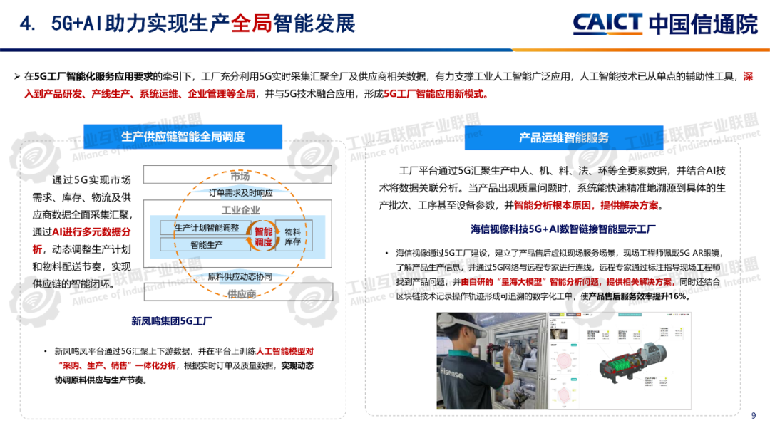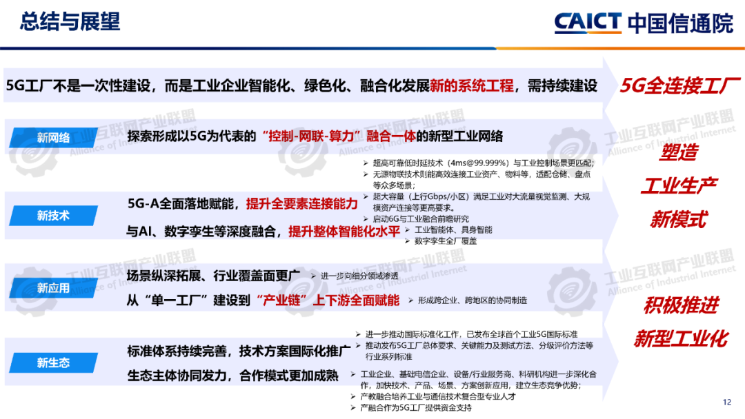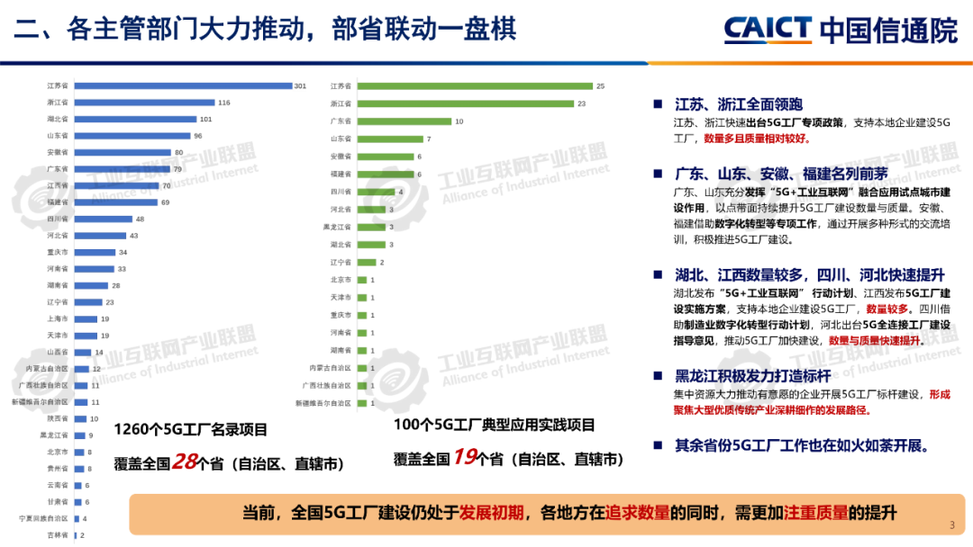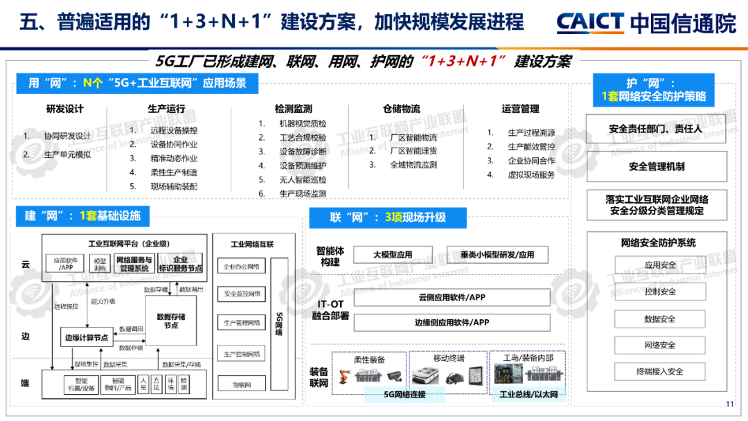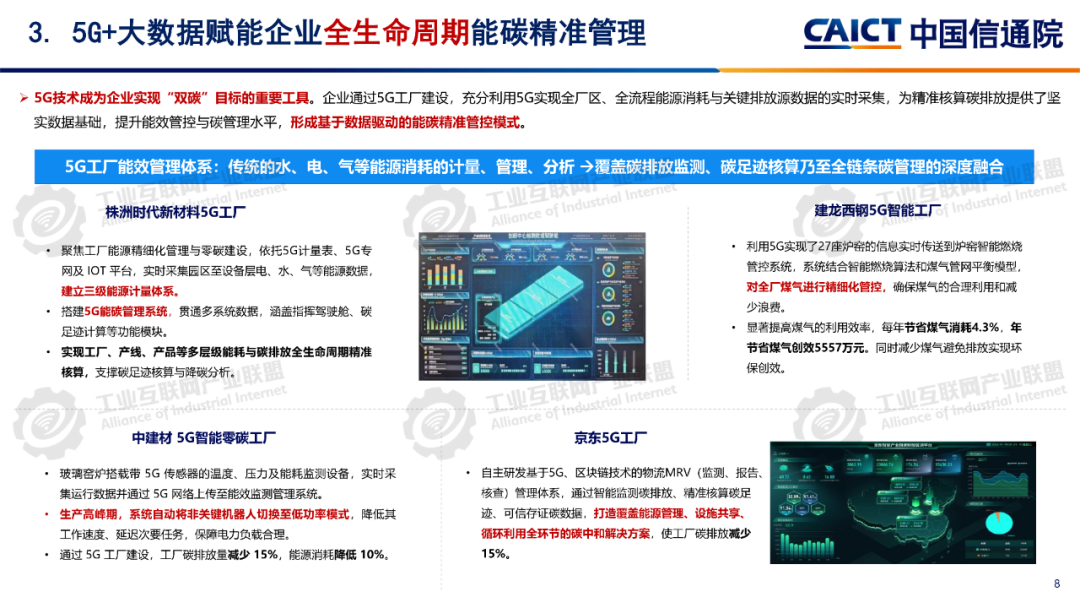 報告分析,12605G工廠名錄項目已覆蓋全國28個省(自治區、直轄市)、9個國民經濟門類、60個國民經濟大類。同時5G工廠作為推進工業和信息化深度融合的重要舉措,原材料工業、裝備工業、消費品工業、電子信息、能源交通等行業企業與基礎電信企業、設備及行業服務商深度合作,形成1005G工廠典型應用實踐,各工廠平均5G網絡覆蓋率高達99.3%、現場裝備聯網率高達97.7%、無線設備5G聯網率達97%,“5G+工業互聯網”應用場景建設數量達10.5個,5G在工廠內由“單點”應用向全環節、全流程、全周期、全局、自主協同等“綜合”應用發展。一是加速企業全環節柔性生產。5G工廠推動工廠網絡無線化,通過5G全廠覆蓋,探索實現生產現場裝備云化群體控制、產線模塊化快速重構、供應鏈實時動態協同等,從而支撐企業依據市場需求,實現全環節快速調整的柔性生產方式。二是5G+數字孿生實現生產全流程精益管控。通過5G工廠系統性實施, “5G+數字孿生”已從產品研發設計、企業生產運營的可視化應用,擴展到安全生產閉環管控、廠區物流實時優化、關鍵部件精準運維等應用,實現了“虛實映射、實時監控”的工廠生產全流程精益管理。三是5G+大數據賦能企業全生命周期能碳精準管理企業通過5G工廠建設,充分利用5G實現全廠區、全流程能源消耗與關鍵排放源數據的實時采集,構建包含碳排放監測、碳足跡核算、全鏈條碳管理等功能的能效管理體系,形成基于數據驅動的能碳精準管控模式四是5G+AI助力實現生產全局智能發展5G工廠智能化服務應用要求的牽引下,工廠充分利用5G實時采集匯聚全廠及供應商相關數據,推動人工智能應用從單點輔助工具,深入到產品研發、產線生產、系統運維、企業管理等全局,形成生產供應鏈智能全局調度,產品運維智能服務等新模式。五是5G+AI融合形成多機自主協同操控。隨著5G工廠建設質量的不斷提升,5G高可靠、低時延性能不斷增強,人工智能技術的應用開發,設備遠程操控將從早期依賴人工判斷和操作的單點遠程操控,向由數據驅動的多設備自感知、自適應、自決策的智能化無人自主協同操控演進。
