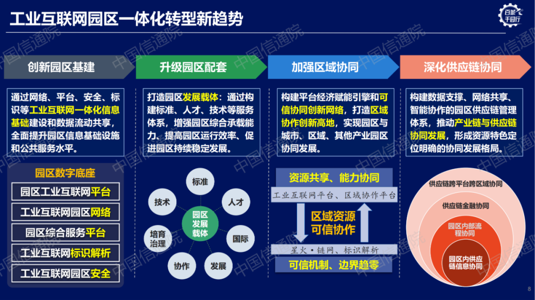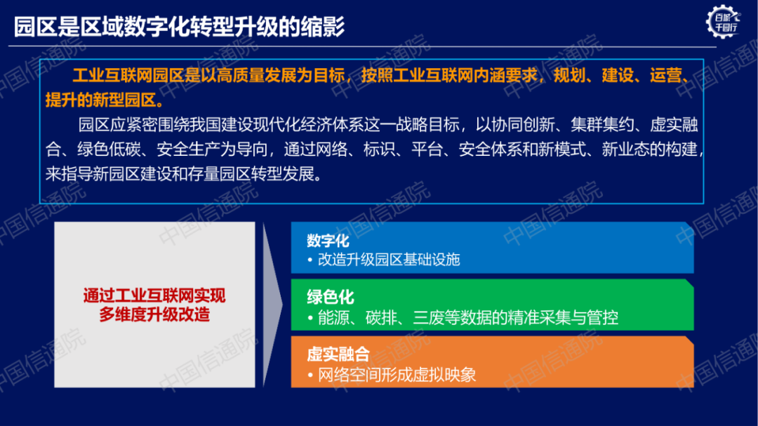 工業(yè)互聯(lián)網(wǎng)園區(qū)是以高質(zhì)量發(fā)展為目標(biāo),按照工業(yè)互聯(lián)網(wǎng)內(nèi)涵要求,規(guī)劃、建設(shè)、運營、提升的新型園區(qū)。園區(qū)應(yīng)緊密圍繞我國建設(shè)現(xiàn)代化經(jīng)濟(jì)體系這一戰(zhàn)略目標(biāo),以協(xié)同創(chuàng)新、集群集約、虛實融合、綠色低碳、安全生產(chǎn)為導(dǎo)向,通過網(wǎng)絡(luò)、標(biāo)識、平臺、安全體系和新模式、新業(yè)態(tài)的構(gòu)建,來指導(dǎo)新園區(qū)建設(shè)和存量園區(qū)轉(zhuǎn)型發(fā)展。