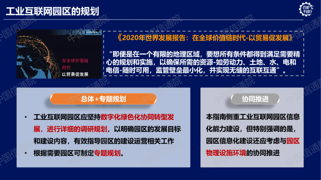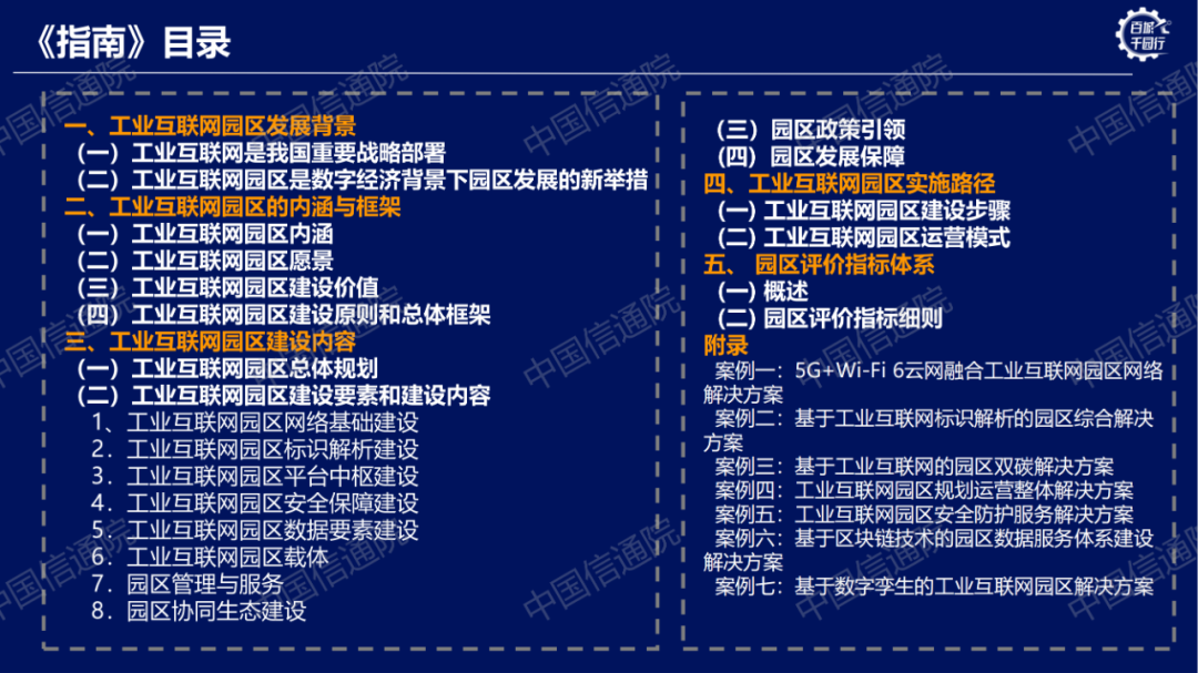 中國信通院總工程師敖立對指南(2.0版本)進(jìn)行了詳細(xì)解讀。他指出指南(2.0版本)整體包括發(fā)展背景、內(nèi)涵框架、建設(shè)內(nèi)容、實施路徑和評價指標(biāo)五個部分。圍繞數(shù)字經(jīng)濟(jì)、綠色低碳、中小企業(yè)特色產(chǎn)業(yè)集群等最新相關(guān)政策,更新了工業(yè)互聯(lián)網(wǎng)園區(qū)的最新發(fā)展背景、內(nèi)涵與框架,細(xì)化了標(biāo)識、數(shù)據(jù)等園區(qū)建設(shè)內(nèi)容,增加了線上線下一體化的園區(qū)新運營模式總結(jié),并相應(yīng)的對評價指標(biāo)體系進(jìn)行了優(yōu)化調(diào)整。同時,結(jié)合工業(yè)互聯(lián)網(wǎng)園區(qū)近幾年的發(fā)展態(tài)勢,節(jié)選部分優(yōu)秀案例,以饗讀者。