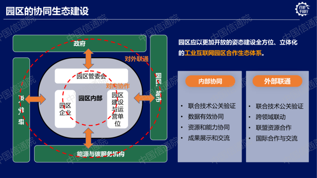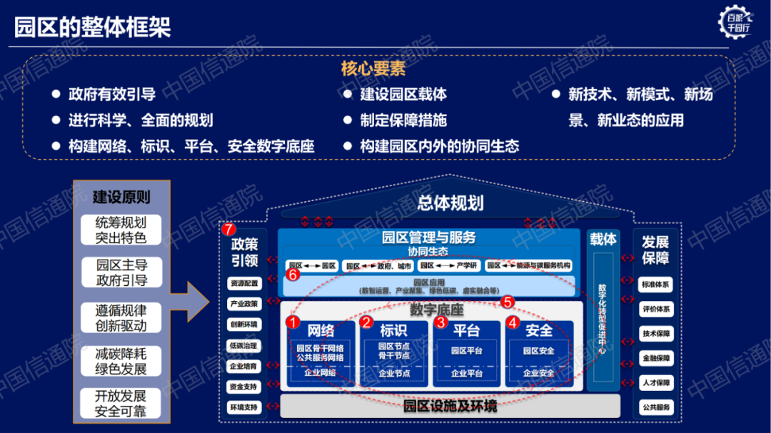 工業(yè)互聯(lián)網(wǎng)園區(qū)整體框架:工業(yè)互聯(lián)網(wǎng)園區(qū)的建設(shè)與發(fā)展,應(yīng)在國家和各級地方政府政策措施的引領(lǐng)下,以科學(xué)規(guī)劃為指導(dǎo),通過打造網(wǎng)絡(luò)、標(biāo)識、平臺、安全等園區(qū)數(shù)字底座,構(gòu)建園區(qū)內(nèi)部與外部的數(shù)據(jù)流動閉環(huán),形成各產(chǎn)業(yè)角色之間的協(xié)同有機生態(tài)。建設(shè)數(shù)字化轉(zhuǎn)型促進(jìn)中心等載體,以標(biāo)準(zhǔn)、評價、金融等體系為保障,通過新技術(shù)、新模式、新場景、新業(yè)態(tài)的應(yīng)用,形成園區(qū)的健康、低碳、良性、區(qū)域一體化發(fā)展的新發(fā)展模式,建立園區(qū)發(fā)展特色和發(fā)展優(yōu)勢。