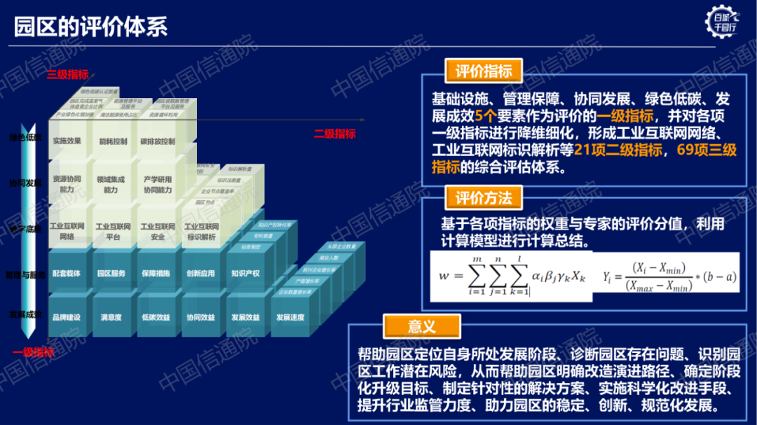 工業(yè)互聯(lián)網(wǎng)園區(qū)評價指標(biāo)體系通過科學(xué)的方法,分別從數(shù)字底座、管理與服務(wù)、協(xié)同發(fā)展、綠色低碳、發(fā)展成效5個要素作為評價的一級指標(biāo),并對各項一級指標(biāo)進(jìn)行細(xì)化,形成工業(yè)互聯(lián)網(wǎng)網(wǎng)絡(luò)、工業(yè)互聯(lián)網(wǎng)標(biāo)識解析等21項二級指標(biāo),69項三級指標(biāo)的綜合評估體系。