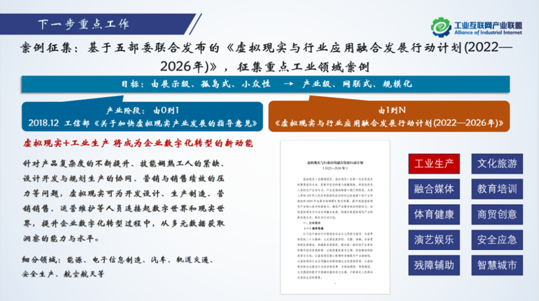 下一步,工業VR/AR特設組將基于五部委聯合發布的《虛擬現實與行業應用融合發展行動計劃(2022-2026年)》,征集包括能源、電子信息制造、汽車、軌道交通、安全生產、航空航天等重點工業領域案例。