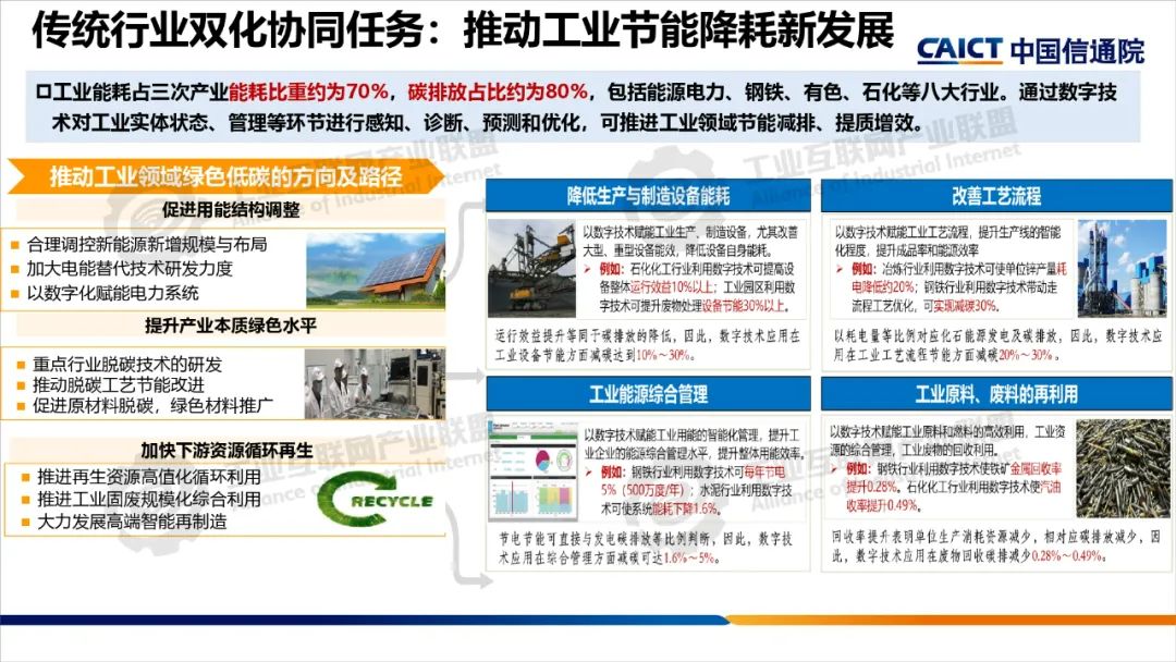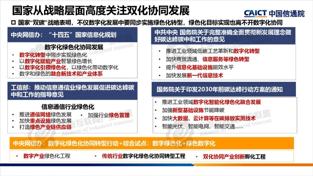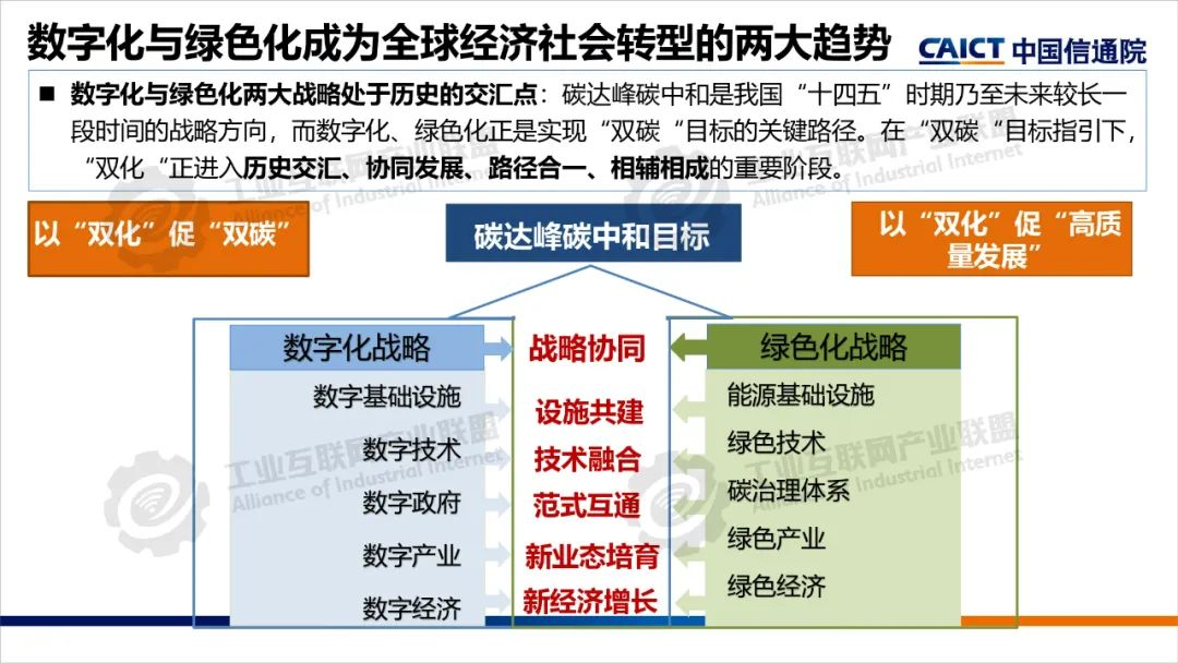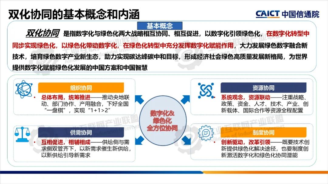 本期為您帶來由中國信息通信研究院產(chǎn)業(yè)與規(guī)劃研究所高級工程師王婧媛分享的《數(shù)字化綠色化協(xié)同轉(zhuǎn)型綜合試點(diǎn)建設(shè)解讀》。數(shù)字化轉(zhuǎn)型和綠色化轉(zhuǎn)型不僅是當(dāng)今世界發(fā)展的兩大主題,也是相互依存、相互促進(jìn)的孿生體。“雙化協(xié)同”是指數(shù)字化與綠色化兩大戰(zhàn)略相互協(xié)同、相互促進(jìn),在數(shù)字化轉(zhuǎn)型中同步實(shí)現(xiàn)綠色化,以綠色化帶動(dòng)數(shù)字化,在綠色化轉(zhuǎn)型中充分發(fā)揮數(shù)字化賦能作用,大力發(fā)展綠色數(shù)字融合新技術(shù),培育綠色數(shù)字產(chǎn)業(yè)新生態(tài)。