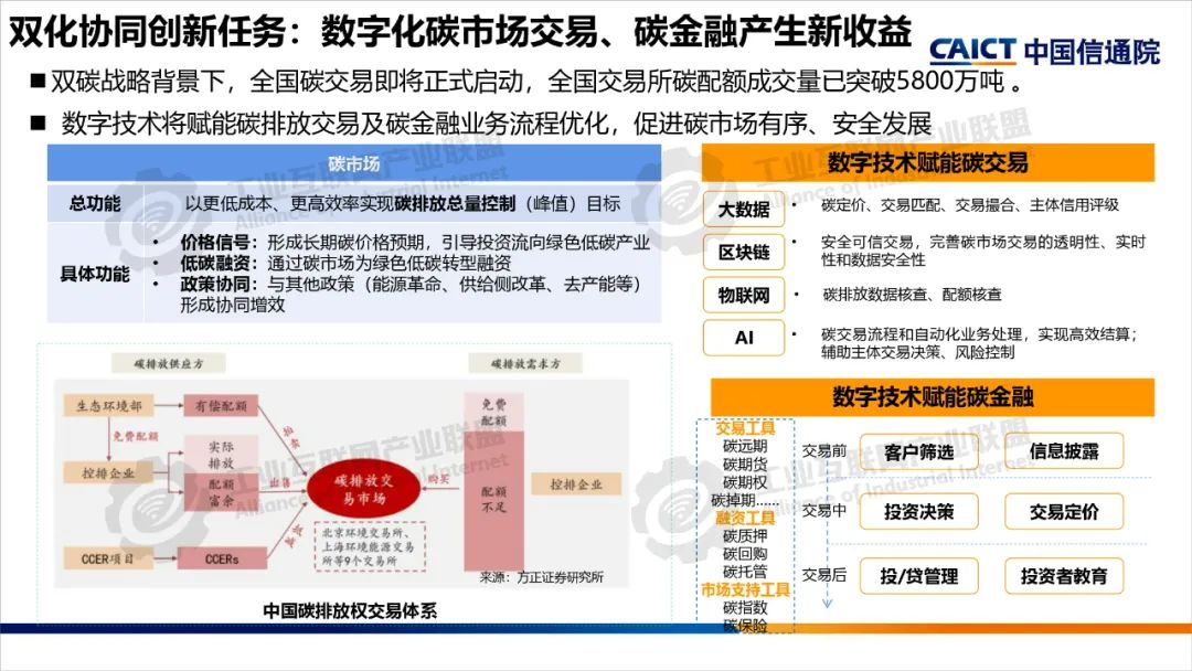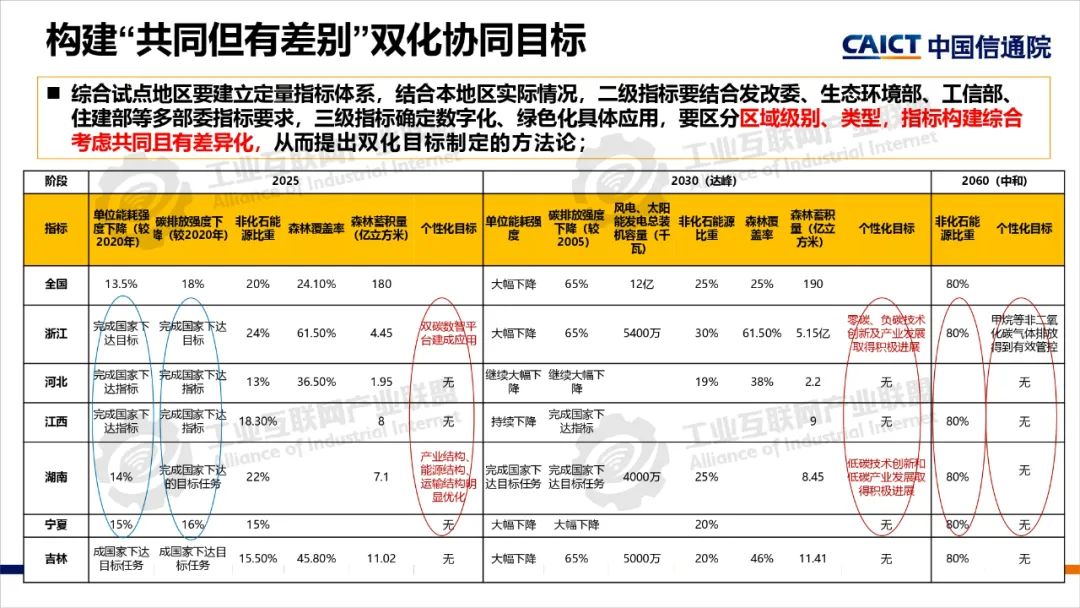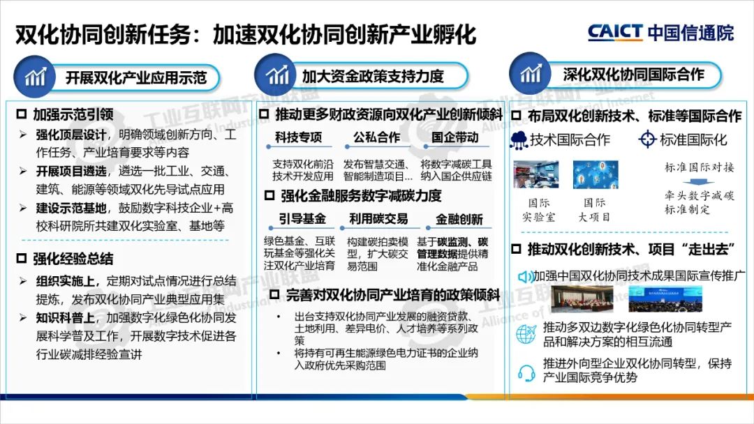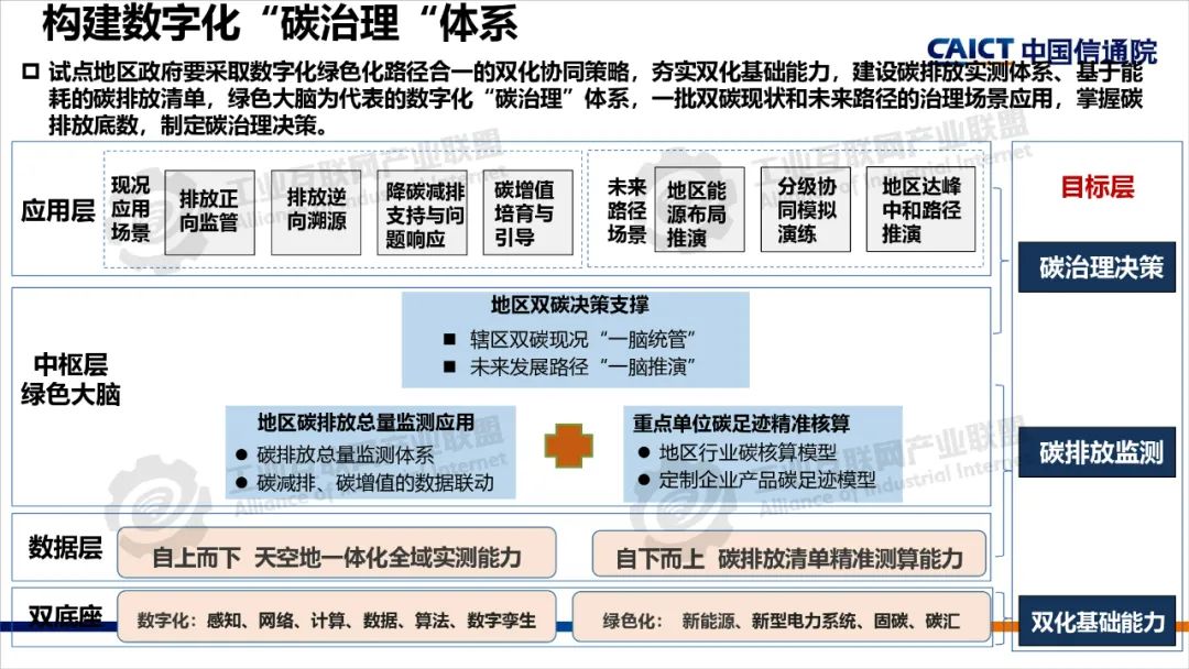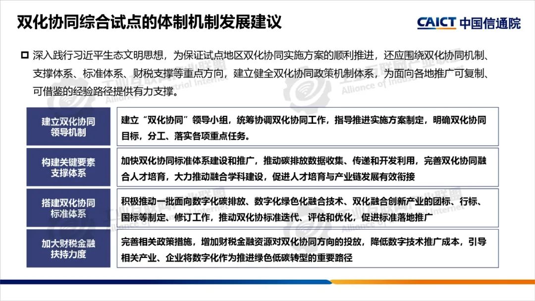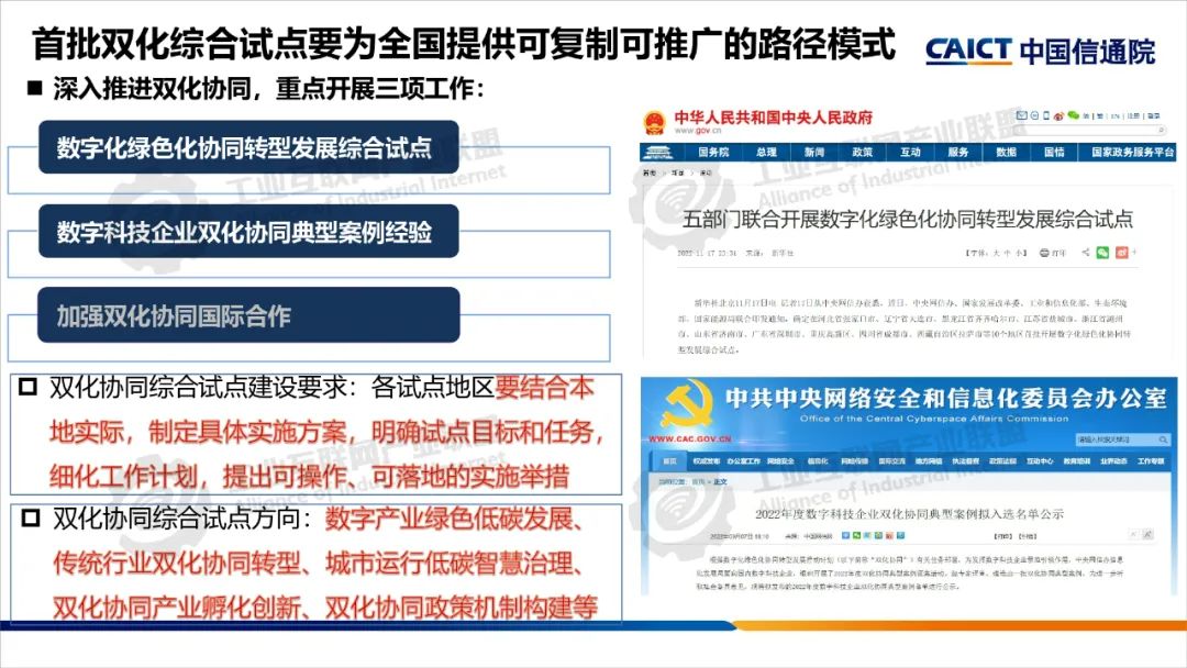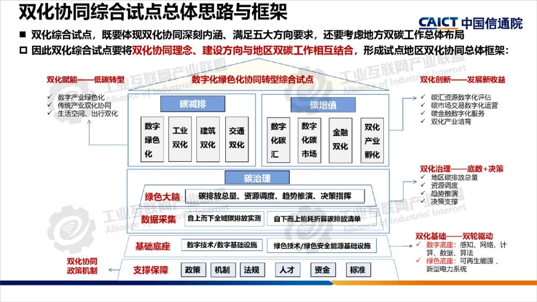 2022年,中央網(wǎng)信辦等五部門聯(lián)合開展了雙化協(xié)同綜合試點(diǎn)建設(shè),要求各試點(diǎn)地區(qū)制定具體實(shí)施方案,部署了五大建設(shè)方向。雙化綜合試點(diǎn)地區(qū)要將雙化協(xié)同理念、建設(shè)方向與地區(qū)雙碳工作相互結(jié)合,從打造數(shù)字底座+綠色底座夯實(shí)雙化基礎(chǔ),以雙化治理探明地區(qū)碳排放底數(shù)、支撐決策治理,以雙化賦能實(shí)現(xiàn)數(shù)字產(chǎn)業(yè)綠色化、傳統(tǒng)產(chǎn)業(yè)和生活低碳化,以雙化創(chuàng)新開展數(shù)字化生態(tài)資源、碳市場和碳金融的高效價(jià)值轉(zhuǎn)化,培育雙化新技術(shù)、新產(chǎn)業(yè),最后還要配套雙化協(xié)同政策、要素、標(biāo)準(zhǔn)、財(cái)稅等機(jī)制創(chuàng)新。