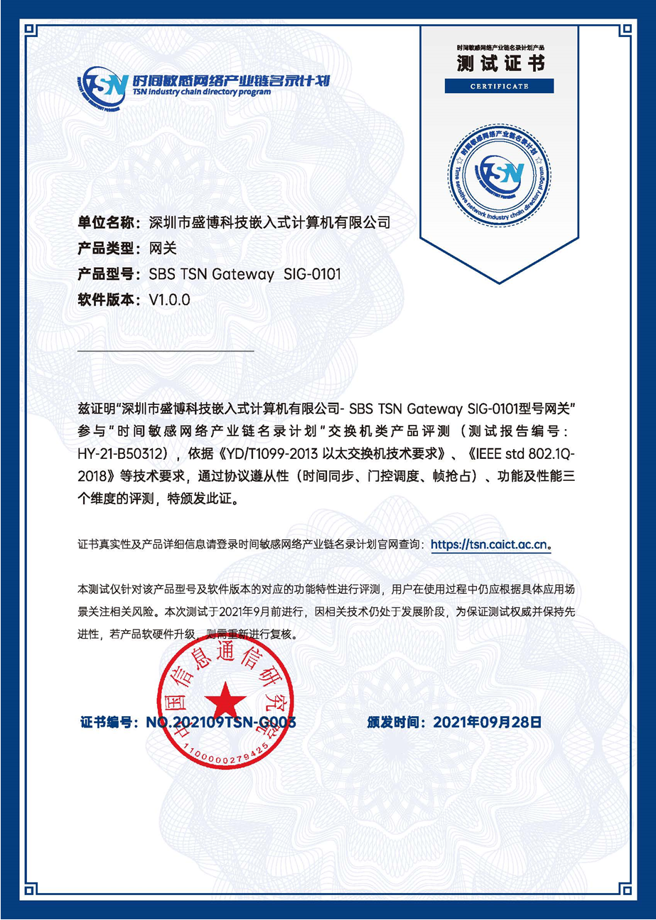 2021年9月,深圳市盛博科技嵌入式計(jì)算機(jī)有限公司研發(fā)的SIG-0101網(wǎng)關(guān)在互聯(lián)網(wǎng)與工業(yè)融合創(chuàng)新工信部重點(diǎn)實(shí)驗(yàn)室順利通過“TSN產(chǎn)業(yè)鏈名錄計(jì)劃”產(chǎn)品測(cè)試,獲得網(wǎng)關(guān)類測(cè)試證書,成為第一批加入產(chǎn)業(yè)鏈名錄計(jì)劃的產(chǎn)品。