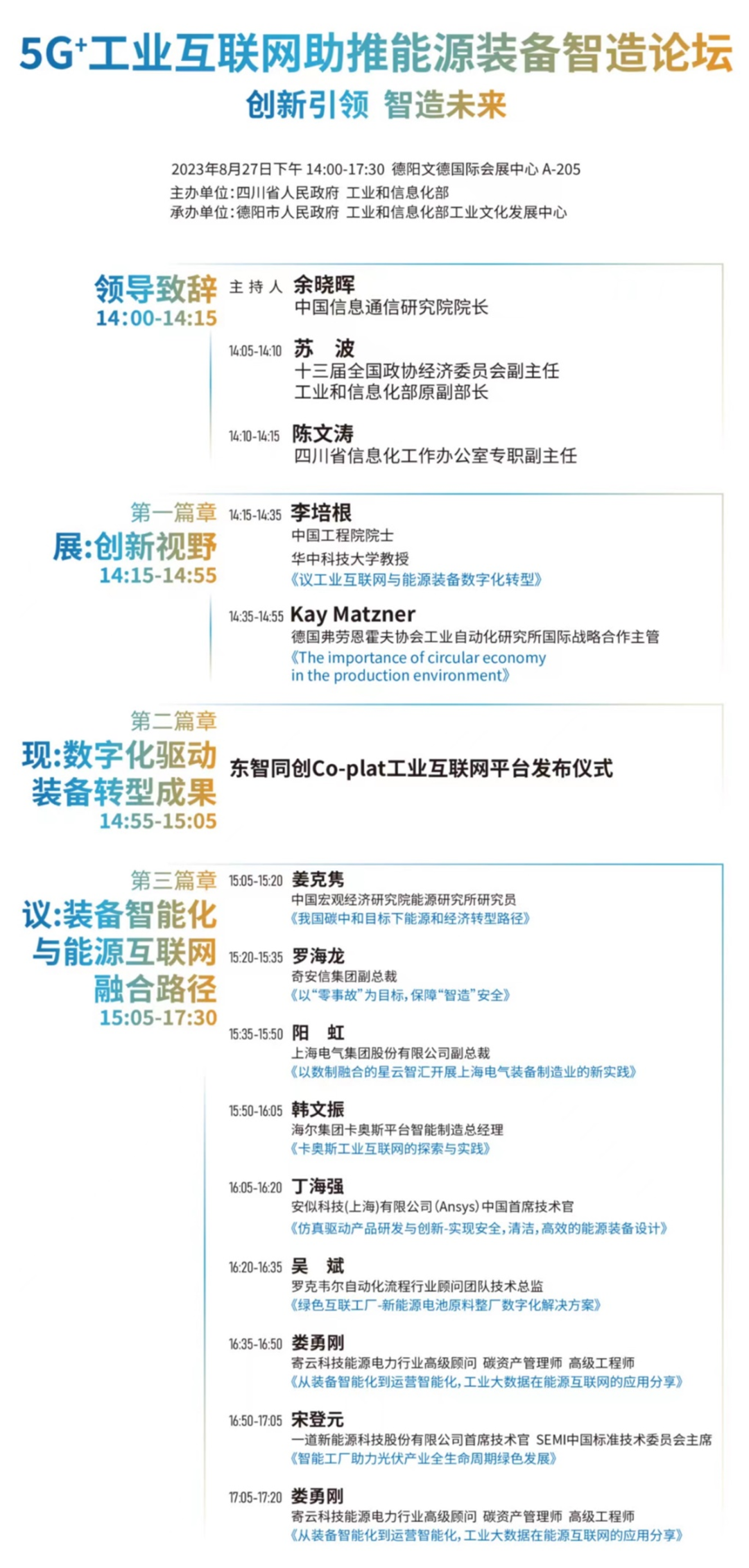 8月27日下午,由四川省人民政府、工業(yè)和信息化部主辦的2023世界清潔能源裝備大會-5G+工業(yè)互聯(lián)網(wǎng)助推能源裝備智造論壇議即將召開。