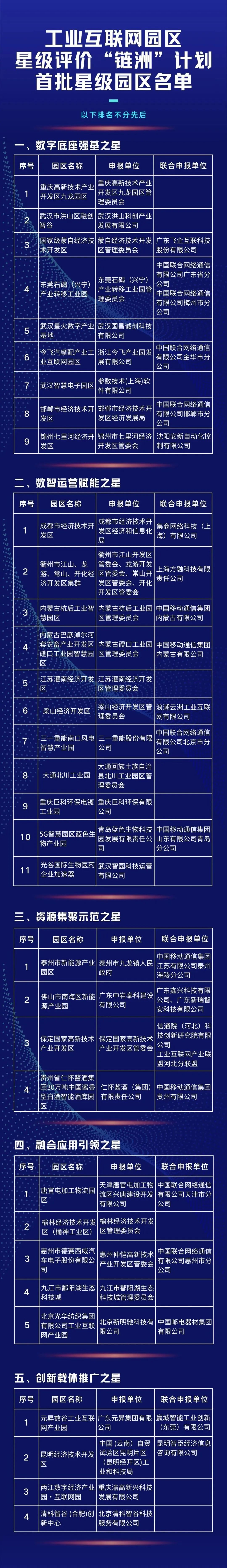 2023年11月19日,2023中國(guó)5G+工業(yè)互聯(lián)網(wǎng)大會(huì)工業(yè)互聯(lián)網(wǎng)標(biāo)識(shí)暨“百城千園行”平行會(huì)議在武漢召開(kāi)。大會(huì)由工業(yè)和信息化部、湖北省人民政府主辦,湖北省通信管理局、湖北省經(jīng)濟(jì)和信息化廳、中國(guó)信息通信研究院、工業(yè)互聯(lián)網(wǎng)產(chǎn)業(yè)聯(lián)盟承辦。會(huì)上,《工業(yè)互聯(lián)網(wǎng)園區(qū)星級(jí)評(píng)價(jià)“鏈洲”計(jì)劃首批星級(jí)園區(qū)名單》正式發(fā)布。“鏈洲”計(jì)劃是踐行工業(yè)互聯(lián)網(wǎng)一體化進(jìn)園區(qū)成效評(píng)估的具體舉措,首批星級(jí)園區(qū)對(duì)引領(lǐng)工業(yè)互聯(lián)網(wǎng)園區(qū)建設(shè)具有示范意義。
