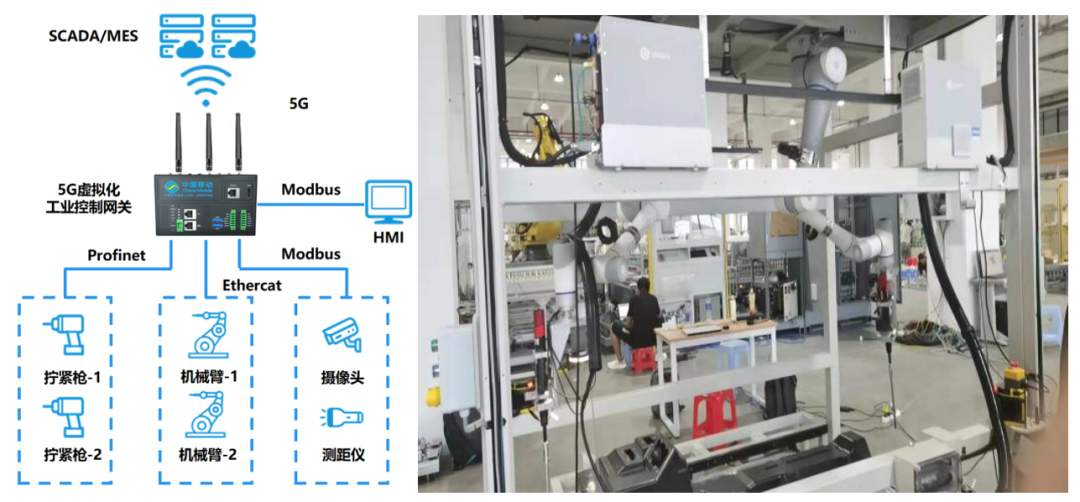 中國移動與國內(nèi)某新能源廠商合作,在電池組裝產(chǎn)線完成5G+虛擬化PLC技術(shù)驗證應(yīng)用。核心方案是采用一臺安裝虛擬化PLC的5G工業(yè)控制網(wǎng)關(guān),實現(xiàn)對“傳統(tǒng)PLC+數(shù)采網(wǎng)關(guān)”的二合一替換。5G工業(yè)控制網(wǎng)關(guān)首先通過掃描槍、測距儀完成位置標定,控制機械臂移動到電池模組位置。隨后控制機械臂上的擰緊槍完成電池模組的安裝擰緊。在此案例中,5G工業(yè)控制網(wǎng)關(guān)不僅提供PLC實時控制服務(wù),也提供5G數(shù)據(jù)采集、遠程運維服務(wù)。從而將傳統(tǒng)的“現(xiàn)場I/O-PLC-數(shù)采網(wǎng)關(guān)”三層架構(gòu)壓縮成“現(xiàn)場I/O-5G工業(yè)控制網(wǎng)關(guān)”扁平架構(gòu),解決了傳統(tǒng)方案控制層級多、專用設(shè)備多,成本居高不下,難以實現(xiàn)無人化/少人化運維等痛點問題,設(shè)備硬件成本和運維成本均下降50%。