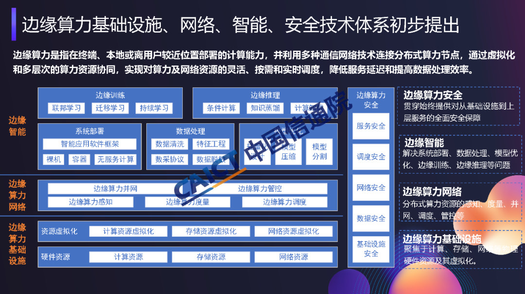 作為業(yè)界首個以邊緣算力為主題的研究報告,《邊緣算力藍(lán)皮書》系統(tǒng)闡述了邊緣算力整體發(fā)展態(tài)勢,凝練了邊緣算力資源異構(gòu)、網(wǎng)絡(luò)異構(gòu)、泛在分布、低時延、低成本、高隱私的六大關(guān)鍵特征;重點總結(jié)了邊緣算力基礎(chǔ)設(shè)施、邊緣算力網(wǎng)絡(luò)、邊緣智能以及邊緣算力安全四大關(guān)鍵技術(shù)方向;詳細(xì)梳理了邊緣算力在工業(yè)互聯(lián)網(wǎng)、智慧社區(qū)、軌道交通等垂直領(lǐng)域的應(yīng)用模式;提出了完善標(biāo)準(zhǔn)體系、加強基礎(chǔ)設(shè)施建設(shè)、推動邊緣算力共享等發(fā)展建議,為推動邊緣算力應(yīng)用落地提供理論支撐及實踐參考。