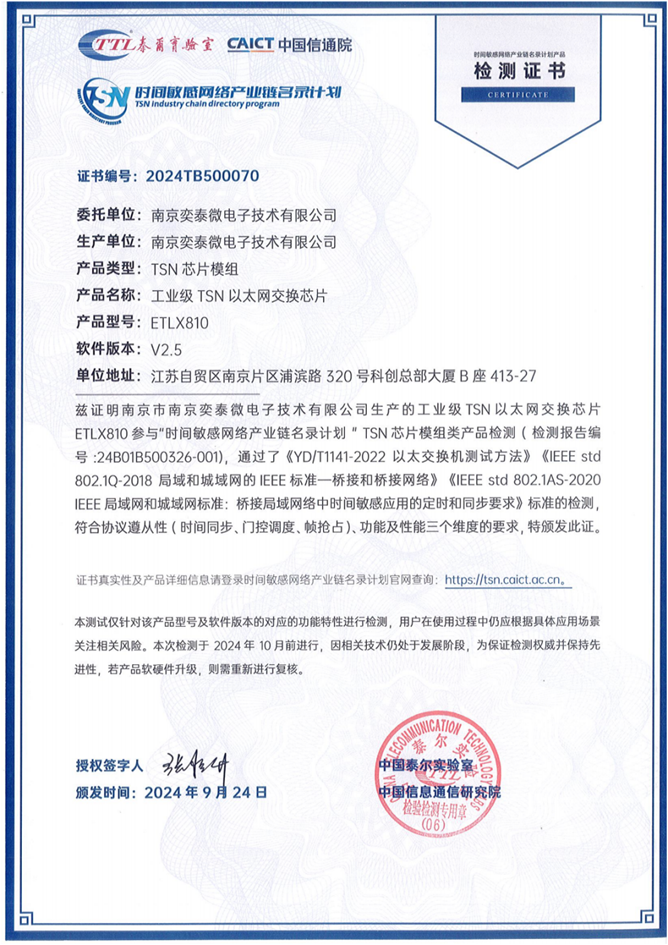 2024年9月,南京奕泰微電子技術(shù)有限公司(以下簡稱奕泰微)研發(fā)的ETL810型工業(yè)以太網(wǎng)TSN交換芯片,在互聯(lián)網(wǎng)與工業(yè)融合創(chuàng)新工信部重點實驗室順利通過名錄計劃產(chǎn)品評測,獲得芯片模組類檢測證書。