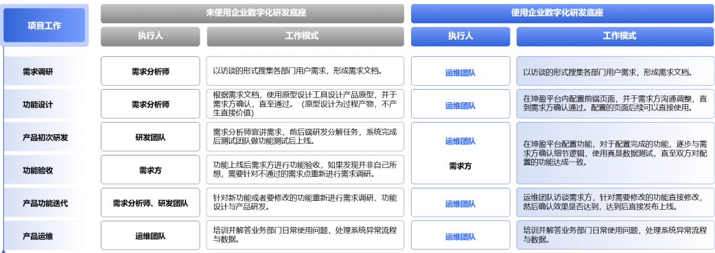 2、工作環(huán)節(jié)不變,但不同環(huán)節(jié)中需要的溝通大大減少,需求調(diào)研的執(zhí)行人就是功能配置的執(zhí)行人,大大縮短不同工種協(xié)同所帶來的溝通成本。