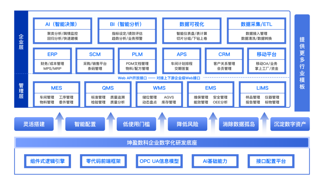 企業(yè)數(shù)字化研發(fā)底座以信息模型概念為基礎(chǔ),搭配坤盈數(shù)科自主研發(fā)的“組件式邏輯引擎”和“零代碼前端框架”等技術(shù)集,面向企業(yè)數(shù)字化研發(fā)過程中面臨的功能研發(fā)、部署、迭代、多系統(tǒng)集成、企業(yè)數(shù)據(jù)挖掘、AI賦能等課題給出了一系列研發(fā)工具。
