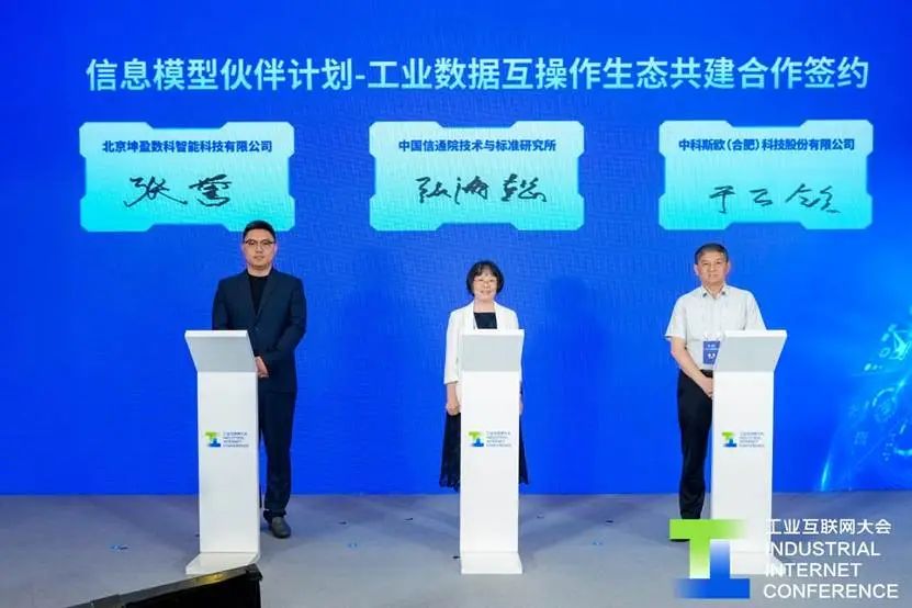 在信息模型伙伴計劃-工業數據互操作生態共建合作簽約儀式環節,中國信通院技術與標準研究所所長張海懿、中科斯歐(合肥)科技股份有限公司董事長于萬欽、北京坤盈數科智能科技有限公司總經理張譽共同簽約。后續,三方將在工業數據互操作領域深化合作,共同開展技術研究、標準編制、案例打造等工作,攜手推動信息模型發展。