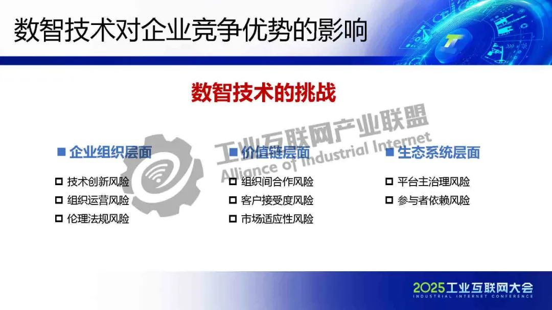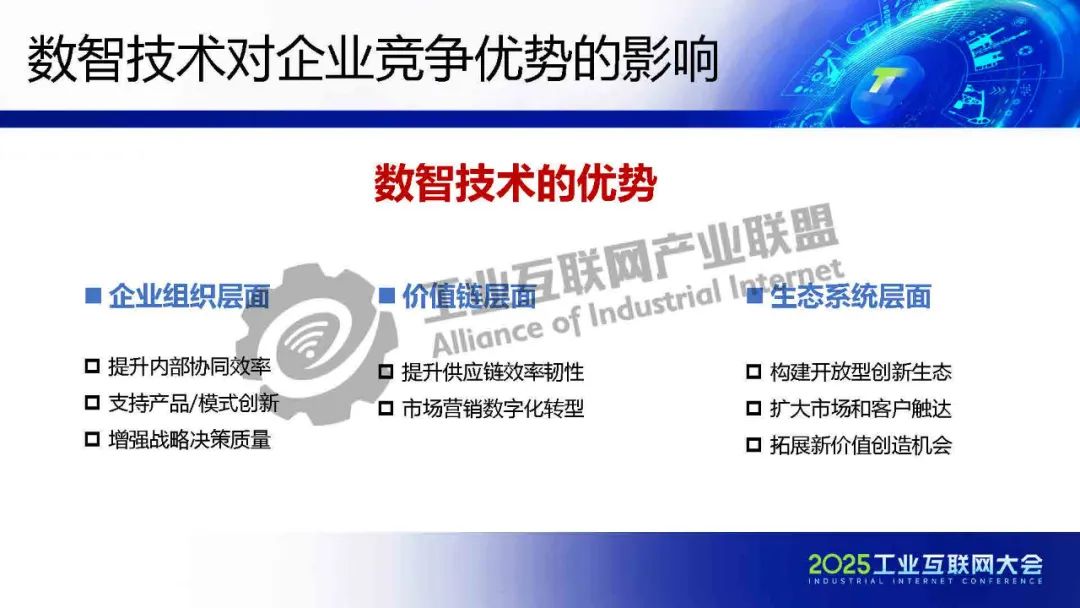 數智技術在企業運營中展現出多層面的優勢。在企業組織層面,它能顯著提升內部協同效率,打破部門壁壘,促進信息流暢共享,支持產品和商業模式創新,為企業帶來新的增長點,通過數據驅動分析增強戰略決策質量,降低決策風險。在價值鏈層面,數智技術可優化供應鏈管理,提高效率與韌性,應對市場波動,推動市場營銷的數字化轉型,實現精準觸達和個性化服務。在生態系統層面,技術助力構建開放型創新生態,促進跨領域合作,通過數字化渠道擴大市場覆蓋和客戶觸達范圍,創造了跨界融合的新價值機會,如數據變現和平臺化服務。這些優勢共同推動企業實現全面數字化轉型,在競爭中占據先機。
