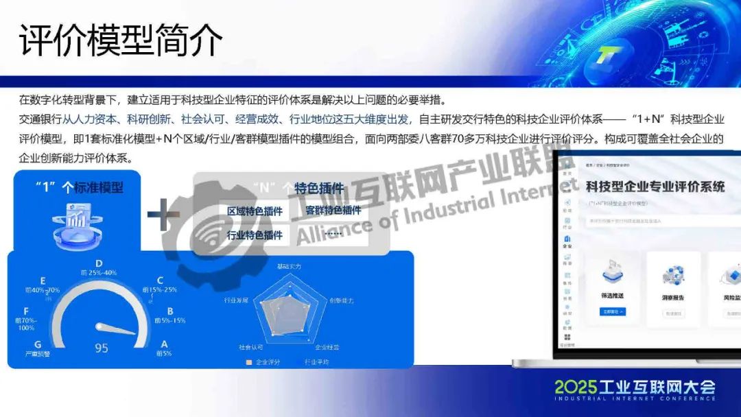 葛鵬介紹,“1+N”評價模型已在交通銀行推廣應用,全面融入科技金融營銷圈客、授信審批、產品設計、風險防控等線上線下業務全流程,并支持交銀投資、交銀金租、交銀國信業務應用。建立“1+N”科技型企業評價模型,并集成融資、結算等金融服務能力+非金融服務,搭建綜合科創服務平臺,推進“數據X科技金融”全場景接力式服務模式,以數字化方式聯動“股債貸租托”產品服務,通過組件化、模塊化方式嵌入政府、投資機構、園區孵化器等科技企業服務流程,搭建科技金融服務生態,打造科技金融“朋友圈”,暢通“科技-產業-金融”良性循環,助力科技自力自強。