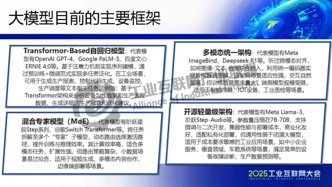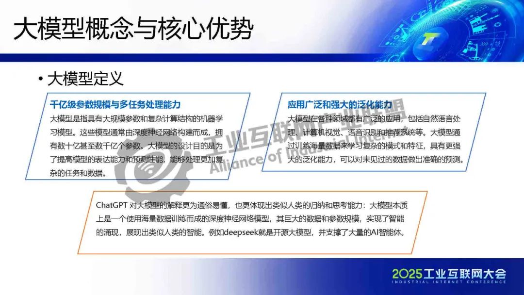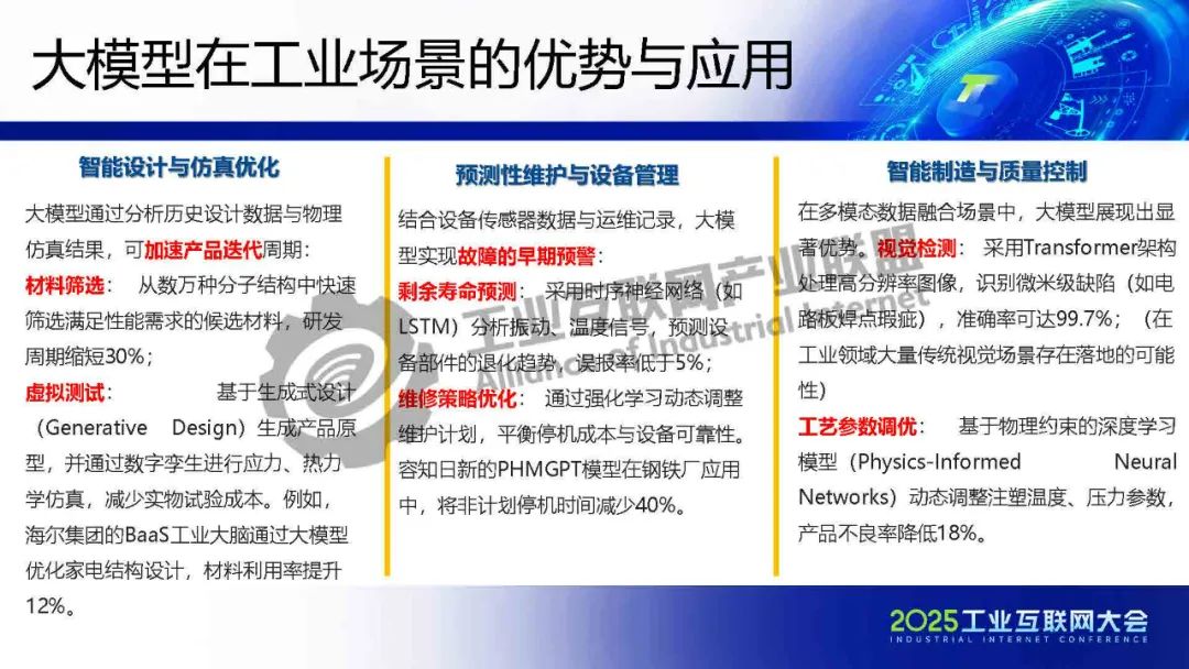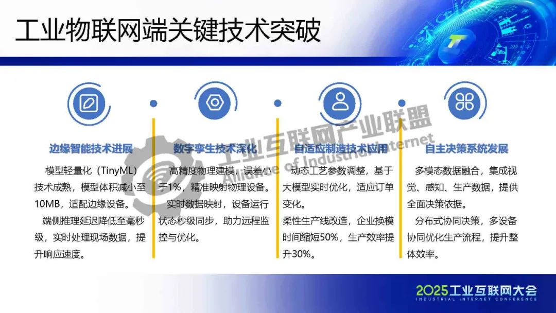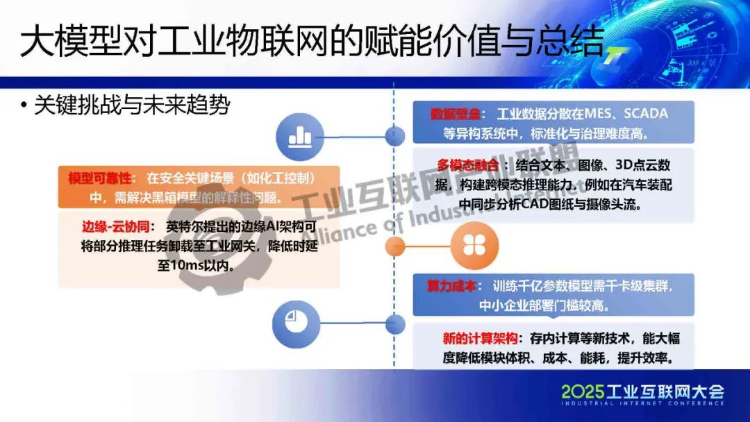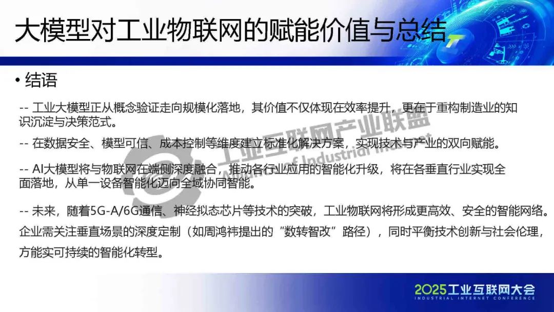 徐明介紹,工業(yè)大模型正從概念驗證走向規(guī)?;涞兀鋬r值不僅體現(xiàn)在效率提升,更在于重構(gòu)制造業(yè)的知識沉淀與決策范式。在數(shù)據(jù)安全、模型可信、成本控制等維度建立標準化解決方案,實現(xiàn)技術(shù)與產(chǎn)業(yè)的雙向賦能。未來,隨著5G-A/6G通信、神經(jīng)擬態(tài)芯片等技術(shù)的突破,工業(yè)物聯(lián)網(wǎng)將形成更高效、安全的智能網(wǎng)絡。企業(yè)需關(guān)注垂直場景的深度定制,同時平衡技術(shù)創(chuàng)新與社會倫理,方能實可持續(xù)的智能化轉(zhuǎn)型。
