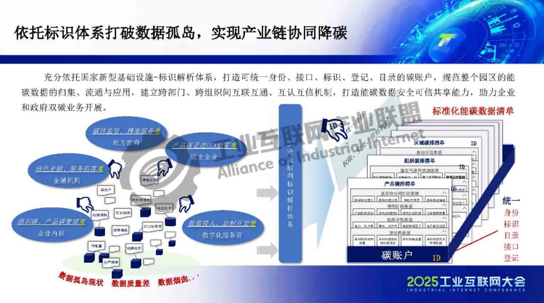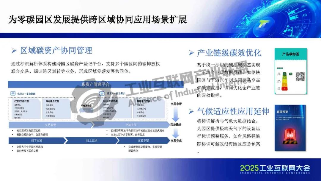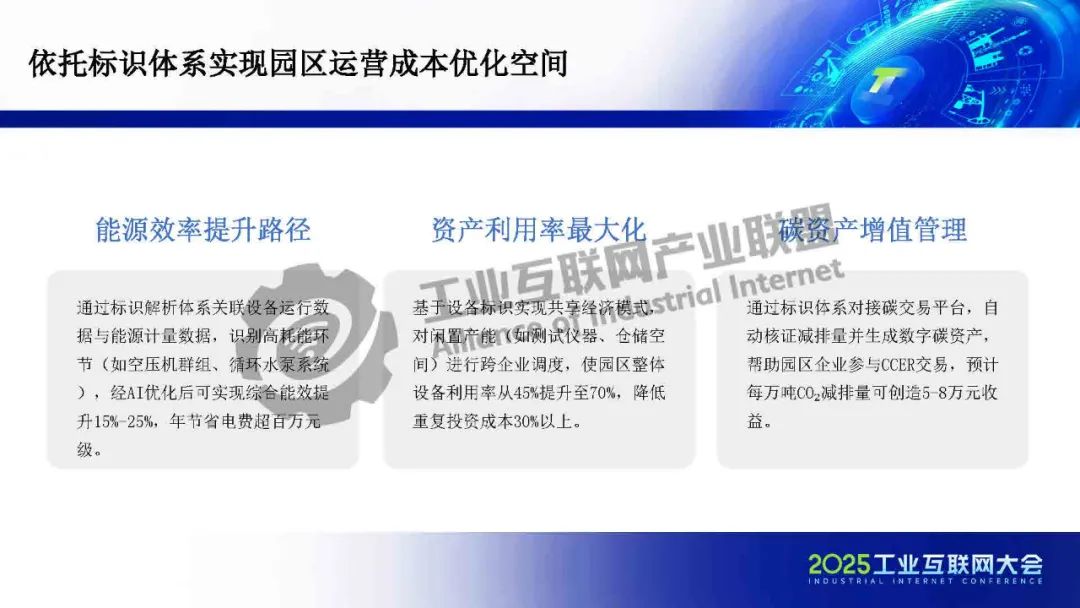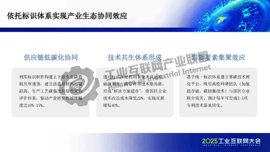 在園區(qū)建設(shè)方面,標(biāo)識(shí)體系作為工信部推動(dòng)全行業(yè)互聯(lián)互通的核心基礎(chǔ)設(shè)施,承擔(dān)著打破行業(yè)壁壘、賦能企業(yè)數(shù)字化升級(jí)的重要使命。一方面,依托標(biāo)識(shí)體系,可以為企業(yè)、產(chǎn)品和設(shè)備賦予統(tǒng)一、可信的數(shù)字身份,實(shí)現(xiàn)數(shù)據(jù)的精準(zhǔn)溯源與全流程管理,為能源效率提升和碳資產(chǎn)增值管理提供有力支撐,從而釋放園區(qū)運(yùn)營(yíng)成本優(yōu)化空間。另一方面,標(biāo)識(shí)體系有助于打通企業(yè)內(nèi)部及產(chǎn)業(yè)鏈上下游的信息壁壘,破解數(shù)據(jù)孤島,進(jìn)一步提升供應(yīng)鏈的低碳協(xié)同效率。
