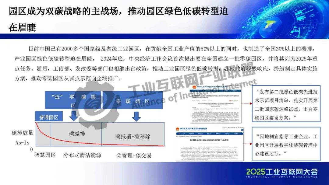 曾西平表示,綠色低碳發(fā)展已成為全球共識(shí),工業(yè)園區(qū)是實(shí)現(xiàn)國(guó)家“3060”雙碳目標(biāo)的關(guān)鍵陣地。目前我國(guó)擁有2000多個(gè)國(guó)家級(jí)和省級(jí)工業(yè)園區(qū),這些園區(qū)貢獻(xiàn)了全國(guó)50%以上的工業(yè)產(chǎn)值,碳排放總量占全國(guó)的30%以上,是推動(dòng)“雙碳”戰(zhàn)略目標(biāo)落地的主力軍。2024年底,中央經(jīng)濟(jì)工作會(huì)議首次將零碳園區(qū)建設(shè)列為2025年重點(diǎn)任務(wù),隨后多部委密集出臺(tái)政策,全面加快工業(yè)園區(qū)綠色低碳轉(zhuǎn)型步伐。