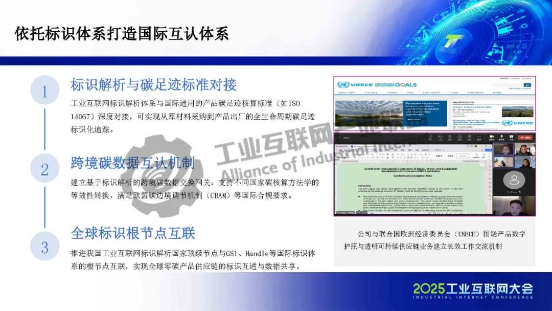 在國(guó)際互認(rèn)方面,依托標(biāo)識(shí)體系,可以構(gòu)建中國(guó)零碳園區(qū)國(guó)際認(rèn)證的高效互認(rèn)體系,增強(qiáng)我國(guó)在綠色貿(mào)易中的話語(yǔ)權(quán)。基于標(biāo)識(shí)解析的跨境碳數(shù)據(jù)交換網(wǎng)關(guān),能夠支持不同國(guó)家碳核算方法學(xué)的等效轉(zhuǎn)換,滿足歐盟碳邊境調(diào)節(jié)機(jī)制(CBAM)等國(guó)際合規(guī)要求,實(shí)現(xiàn)跨境碳數(shù)據(jù)的互認(rèn)。此外,工業(yè)互聯(lián)網(wǎng)標(biāo)識(shí)解析體系還與國(guó)際通用的產(chǎn)品碳足跡核算標(biāo)準(zhǔn)ISO14067深度對(duì)接,可實(shí)現(xiàn)產(chǎn)品從原材料采購(gòu)到出廠全生命周期碳足跡的標(biāo)識(shí)化追蹤。