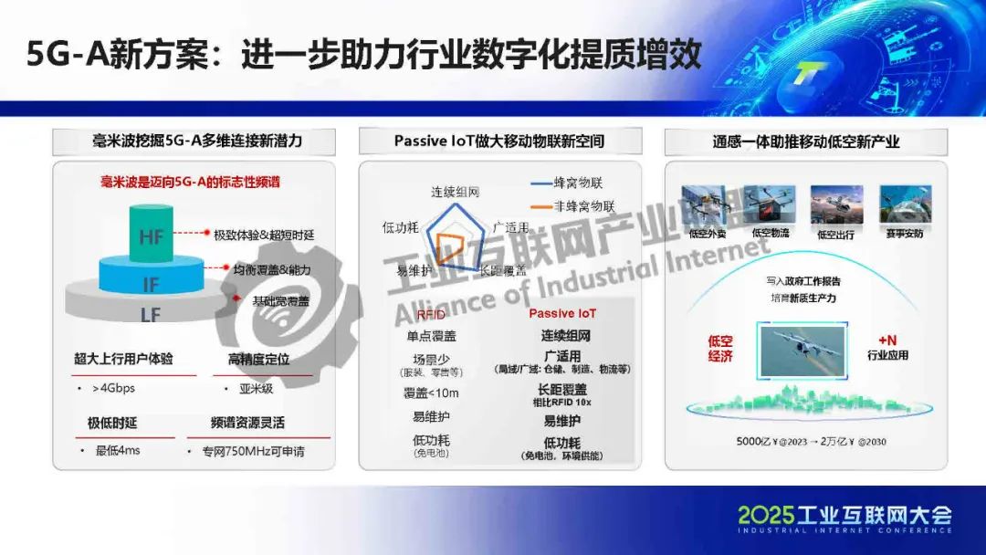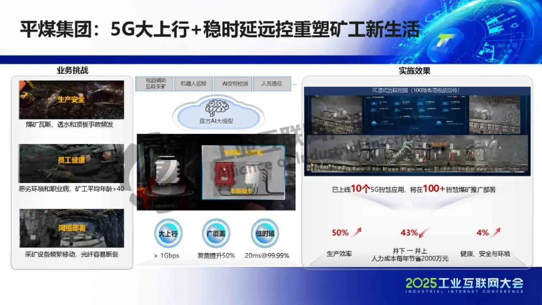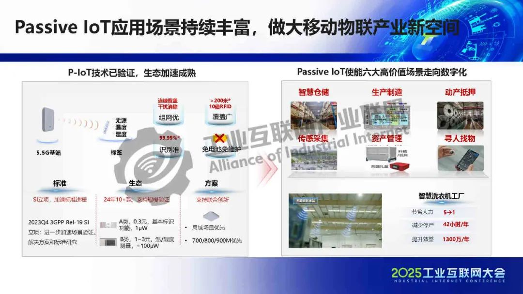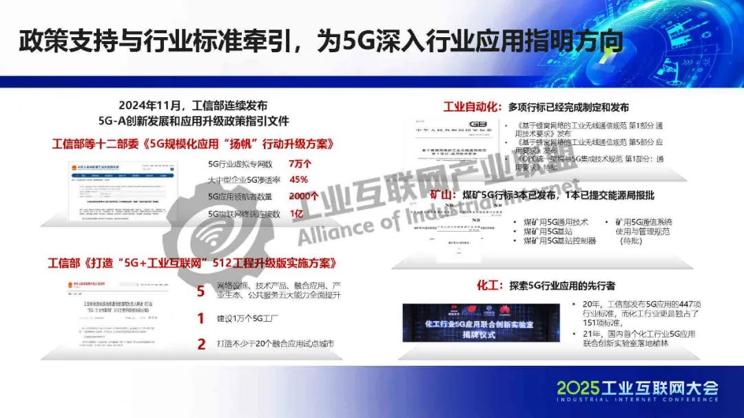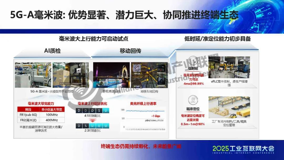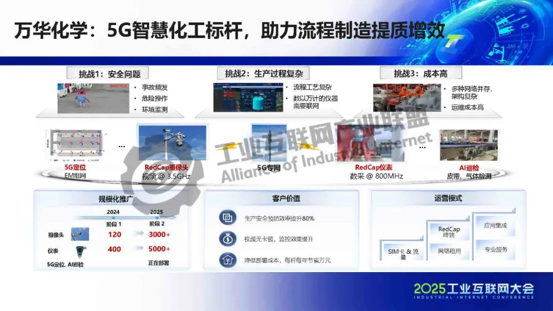 鄒向毅介紹,5G技術(shù)已具備確定性能力,如大上行(700Mbps)、穩(wěn)時延(8±4ms)、準(zhǔn)定位(1-3m),并通過廣域/局域?qū)>W(wǎng)架構(gòu)服務(wù)千行百業(yè)。5G行業(yè)模組和終端形態(tài)豐富,成本持續(xù)下降,加速了工業(yè)應(yīng)用落地。政策支持與行業(yè)標(biāo)準(zhǔn)(如化工、礦山領(lǐng)域)進(jìn)一步推動5G規(guī)模化應(yīng)用,目標(biāo)覆蓋7萬企業(yè)、1億終端連接。典型案例包括:平煤集團(tuán)利用5G實現(xiàn)遠(yuǎn)程采礦,效率提升50%;荊州美的通過全流程5G貫通,降低人工成本30%;勝利油田借助5G無盲區(qū)覆蓋,年省巡檢成本260萬元;萬華化學(xué)以5G專網(wǎng)提升生產(chǎn)安全80%。此外,5G-A新方案(毫米波、Passive IoT、通感一體)將進(jìn)一步釋放潛力,如毫米波實現(xiàn)亞米級定位,Passive IoT免電池覆蓋200米,通感一體助力低空安防。華為5G已賦能制造、電網(wǎng)等80個行業(yè)大類,專網(wǎng)超4萬個,持續(xù)推動工業(yè)數(shù)字化提質(zhì)增效。