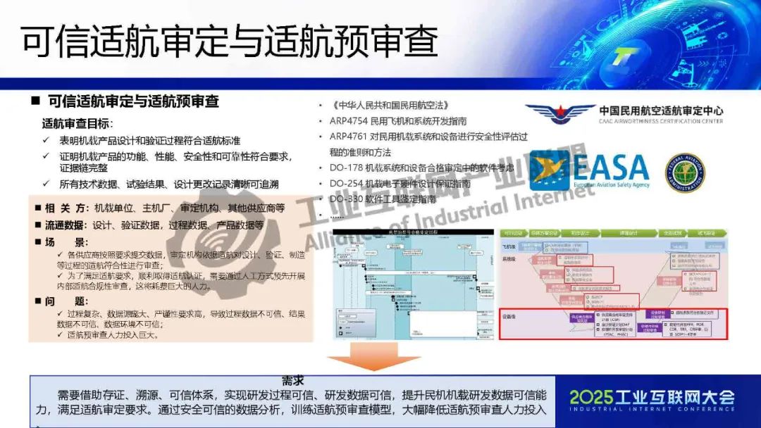 可信適航審定與適航預(yù)審查:需要借助存證、溯源、可信體系,實(shí)現(xiàn)研發(fā)過(guò)程可信、研發(fā)數(shù)據(jù)可信,提升民機(jī)機(jī)載研發(fā)數(shù)據(jù)可信能力,滿足適航審定要求。通過(guò)安全可信的數(shù)據(jù)分析,訓(xùn)練適航預(yù)審查模型,大幅降低適航預(yù)審查人力投入。
