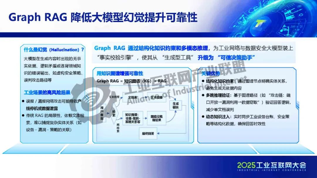 孫浩介紹,盡管DeepSeek等通用大模型迅速崛起并持續突破,但在工業網絡與數據安全等垂直領域應用時,仍面臨專業場景適配性不足等挑戰。工業網絡與安全應用通過對大模型進行針對性訓練,推動其能力與工業網絡及數據安全場景深度融合,確保大模型在工業互聯網安全領域的可靠落地,以通用安全知識為基礎,融合工控安全、工業場景等知識,訓練出具備深度分析、智能決策能力的工業領域網絡與數據安全大模型。