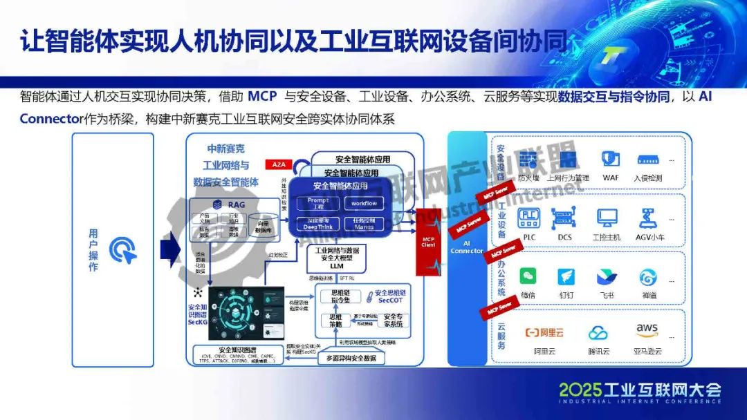智能體通過人機交互實現協同決策,借助 MCP  與安全設備、工業設備、辦公系統、云服務等實現數據交互與指令協同,以 AI Connector作為橋梁,構建中新賽克工業互聯網安全跨實體協同體系。