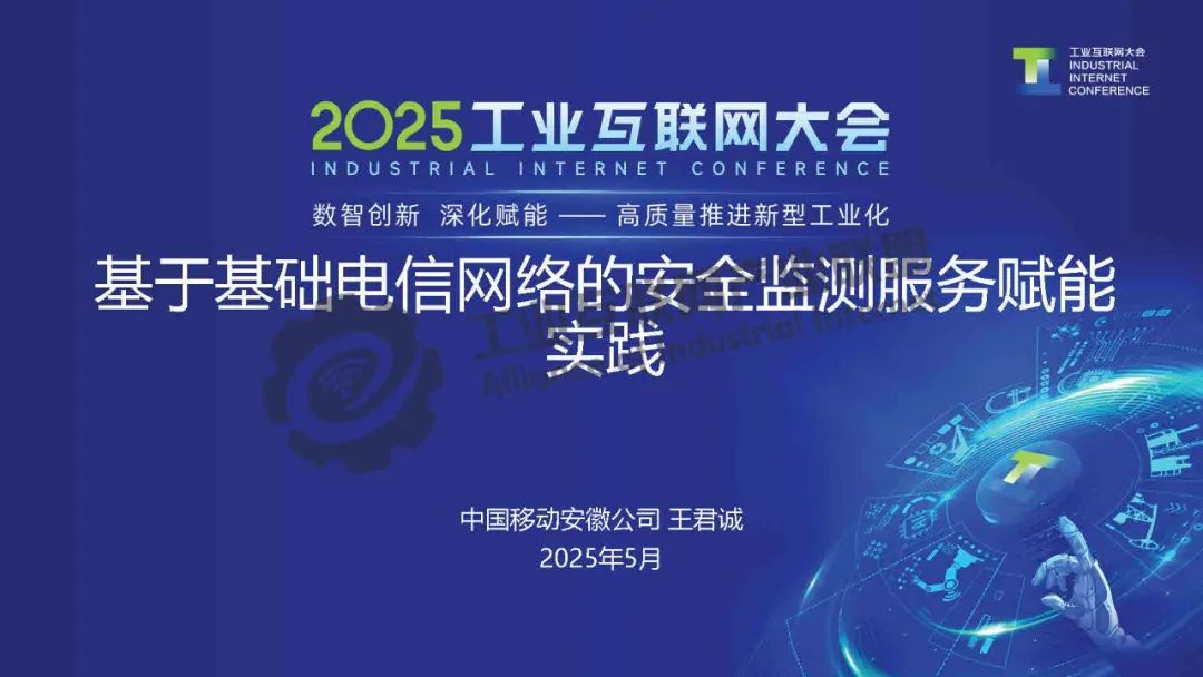 5月23日,在2025工業互聯網大會“新型工業化網絡與數據安全專題活動”上,中國移動通信集團安徽有限公司網管中心網絡安全室經理王君誠發表了《基于基礎電信網絡的安全監測服務賦能實踐》的主題演講。