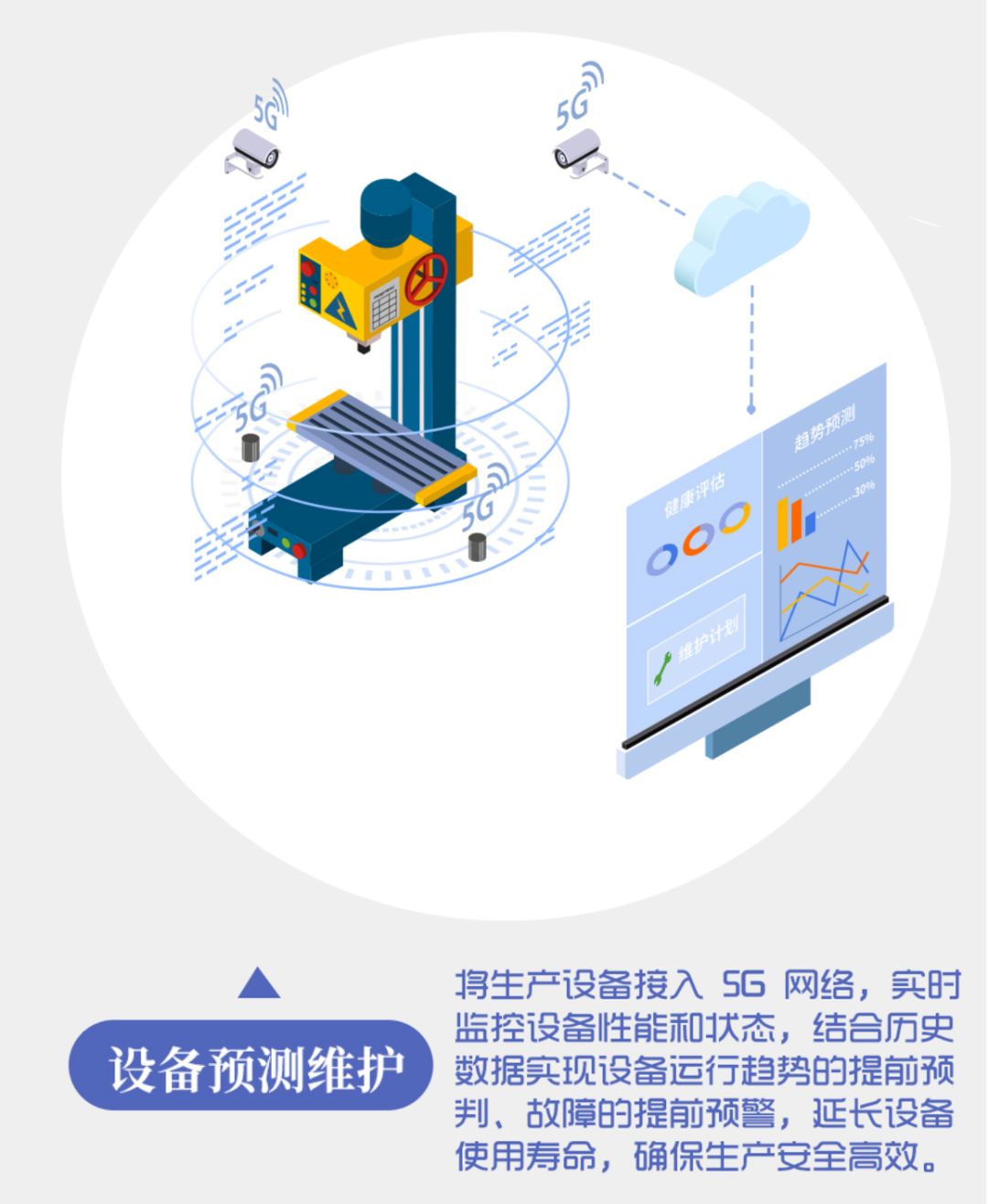將企業(yè)生產(chǎn)現(xiàn)場的工業(yè)設(shè)備、攝像頭、傳感器等接入5G網(wǎng)絡(luò),實時傳輸設(shè)備的運行狀態(tài)至云平臺,實現(xiàn)工業(yè)生產(chǎn)設(shè)備性能和狀態(tài)的實時監(jiān)控,構(gòu)建設(shè)備歷史監(jiān)測數(shù)據(jù)庫。基于故障預(yù)測機理建模等人工智能技術(shù)對監(jiān)測數(shù)據(jù)進行實時分析,評估設(shè)備健康狀態(tài),預(yù)判設(shè)備運行趨勢,智能制定設(shè)備維護保養(yǎng)計劃,實現(xiàn)設(shè)備安全預(yù)測與生產(chǎn)輔助決策,有效降低設(shè)備維護成本,延長設(shè)備使用壽命,確保生產(chǎn)過程連續(xù)、安全、高效。