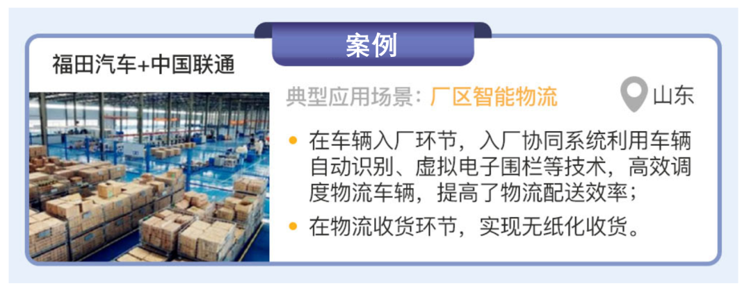 福田汽車與中國聯通合作,在山東省濰坊諸城打造超級卡車工廠基地,利用5G 網絡,實現了廠區智能物流場景的應用。在入廠車輛調度環節,開發集虛擬電子圍欄、車輛自動識別、車輛探測等多種技術于一體的入廠協同系統,利用 5G 技術將廠區車輛泊位狀態等信息實時傳遞到各種智能顯示終端及信息系統,在物流收貨時保管員掃描司機應用程序(APP)上的電子發運單二維碼,通過5G網絡實現無紙化收貨。