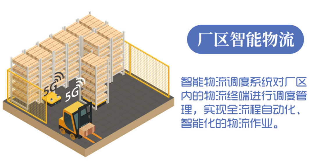 廠區智能物流場景主要包括線邊物流和智能倉儲。線邊物流是指從生產線的上游工位到下游工位、從工位到緩沖倉、從集中倉庫到線邊倉,實現物料定時定點定量配送。智能倉儲是指通過物聯網、云計算和機電一體化等技術共同實現智慧物流,降低倉儲成本、提升運營效率、提升倉儲管理能力。通過內置 5G 模組或部署5G網關等設備可以實現廠區內自動導航車輛(AGV)、自動移動機器人(AMR)、叉車、機械臂和無人倉視覺系統的5G 網絡接入,部署智能物流調度系統,結合 5G MEC+超寬帶(UWB)室內高精定位技術,可以實現物流終端控制、商品入庫存儲、搬運、分揀等作業全流程自動化、智能化。