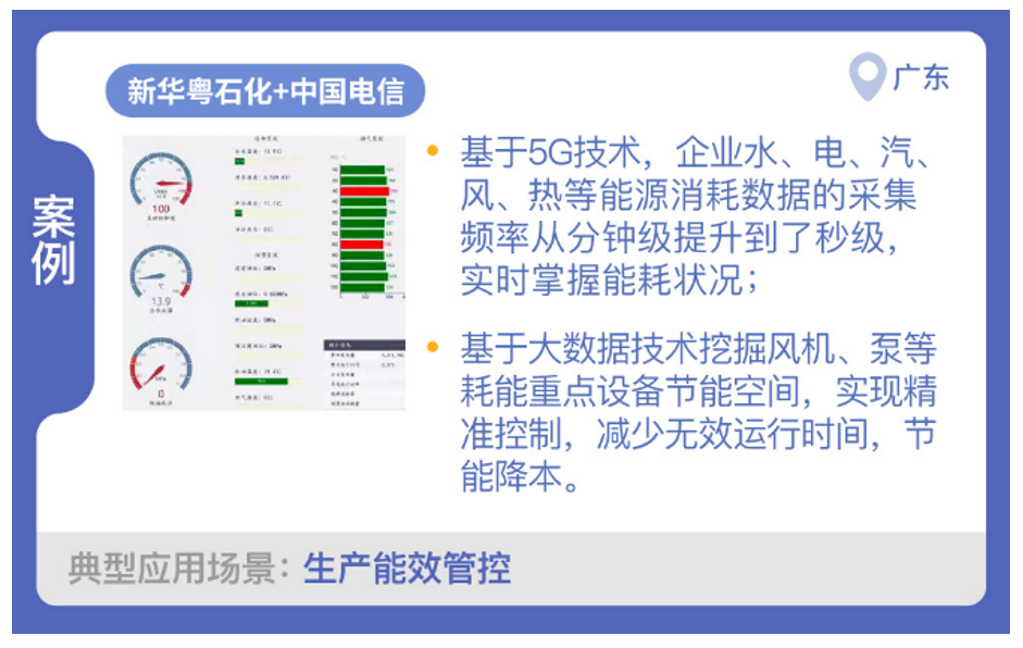 廣東新華粵石化股份有限公司與中國電信合作,開展了“能耗在線監(jiān)測”項目建設(shè),實現(xiàn)了生產(chǎn)能效管控場景的應(yīng)用。利用水表、電表、蒸汽測量儀、風(fēng)速表、冷熱計量表等計量設(shè)備采集企業(yè)水、電、汽、風(fēng)、熱等能源消耗數(shù)據(jù),通過5G網(wǎng)絡(luò)傳輸至企業(yè)綜合能源管理平臺,并按時按需上傳到廣東省能耗在線監(jiān)管平臺,采集頻率從分鐘級提升到了秒級,顯著提升了數(shù)據(jù)采集的效率。綜合能源管理平臺可實時監(jiān)測電流、電壓、冷熱量計量等運行參數(shù),通過用電趨勢分析、用電異常監(jiān)測、用熱對比分析等方法,實時掌握能耗狀況?;诖髷?shù)據(jù)分析技術(shù)挖掘風(fēng)機、泵等耗能重點設(shè)備節(jié)能空間,進行節(jié)能改造,實現(xiàn)精準(zhǔn)控制,減少無效運行時間,提高了生產(chǎn)能耗信息化管理水平,降低了生產(chǎn)成本。