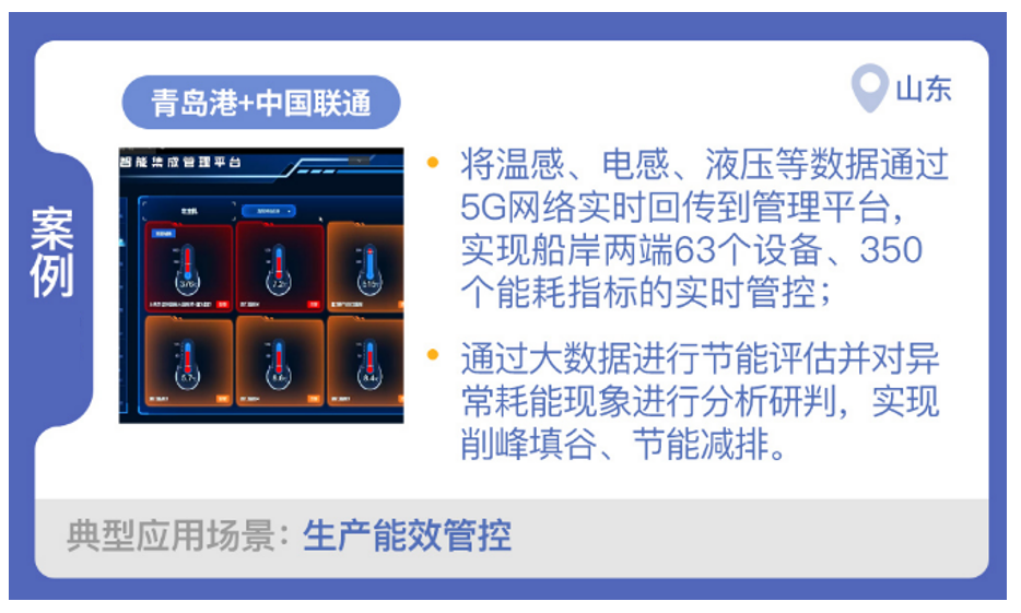 山東港口青島港集團有限公司與中國聯(lián)通合作,開展了“青島港5G智慧港口”項目建設(shè),實現(xiàn)了生產(chǎn)能效管控場景的應(yīng)用。通過5G網(wǎng)絡(luò),將溫感、電感、液壓、煙感等傳感器采集的數(shù)據(jù)實時回傳到智能集成管理平臺,實現(xiàn)船岸兩端63個設(shè)備、350個能耗指標(biāo)的實時管控。通過大數(shù)據(jù)分析對船舶動力系統(tǒng)進行節(jié)能評估,動態(tài)調(diào)整船舶的經(jīng)濟航速,實現(xiàn)削峰填谷、節(jié)能減排。通過自動化采集設(shè)備運行數(shù)據(jù),提升了危險環(huán)境下的安全生產(chǎn)管理能力,提高安全生產(chǎn)預(yù)測效率和管理水平。針對異常耗能現(xiàn)象進行分析研判,為設(shè)備的檢修維護提供決策支持。每年節(jié)省拖輪運維費用100萬元,節(jié)省人工檢測成本40萬元,檢測效率提升30%。