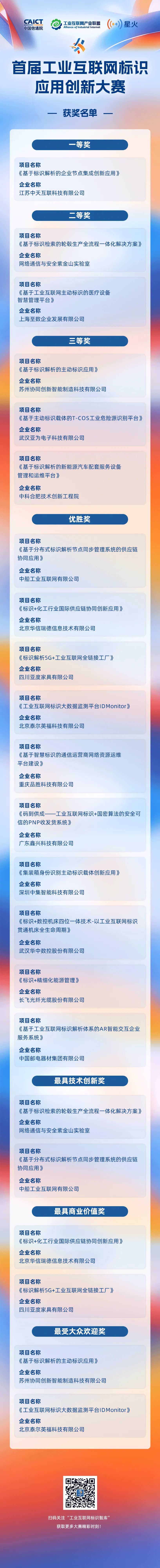 2023年12月13日,首屆工業(yè)互聯(lián)網(wǎng)標(biāo)識應(yīng)用創(chuàng)新大賽總決賽落下帷幕;14日,工業(yè)互聯(lián)網(wǎng)標(biāo)識貫通創(chuàng)新發(fā)展大會暨首屆工業(yè)互聯(lián)網(wǎng)標(biāo)識應(yīng)用創(chuàng)新大賽總決賽頒獎儀式在重慶市舉辦。首屆工業(yè)互聯(lián)網(wǎng)標(biāo)識應(yīng)用創(chuàng)新大賽正式圓滿收官。