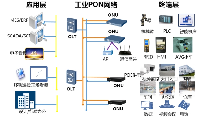 工業(yè)PON技術(shù),適用于承載不同企業(yè)規(guī)模的離散型、流程型制造業(yè)的各類工廠內(nèi)網(wǎng)絡(luò)業(yè)務(wù)。通過(guò)工業(yè)PON終端設(shè)備提供工業(yè)場(chǎng)景下的不同類型物理接口,可為工業(yè)控制、信號(hào)量監(jiān)控、數(shù)據(jù)傳輸、語(yǔ)音通信、視頻監(jiān)控、無(wú)線網(wǎng)絡(luò)承載等各種業(yè)務(wù)應(yīng)用提供支持。