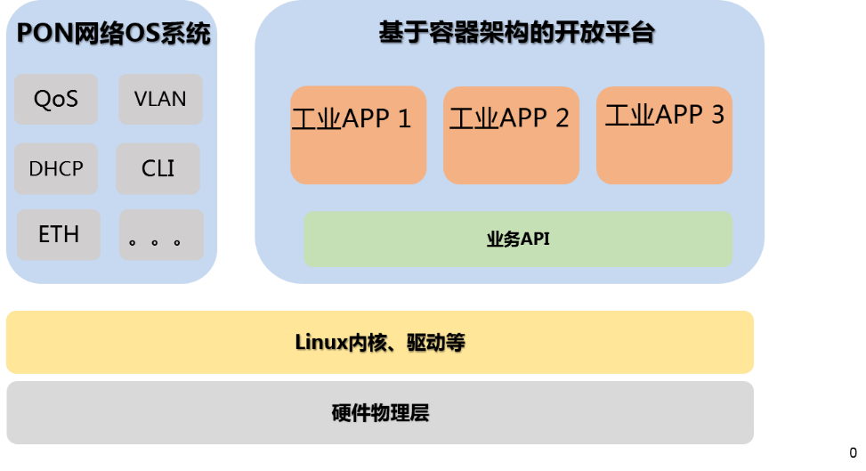 上圖所示為一種開放平臺(tái)的架構(gòu)方案,該開放平臺(tái)軟件架構(gòu)抽象為雙系統(tǒng),包括PON網(wǎng)絡(luò)OS系統(tǒng)、數(shù)據(jù)采集功能的容器系統(tǒng)。雙系統(tǒng)運(yùn)行在同一個(gè)Linux內(nèi)核上。