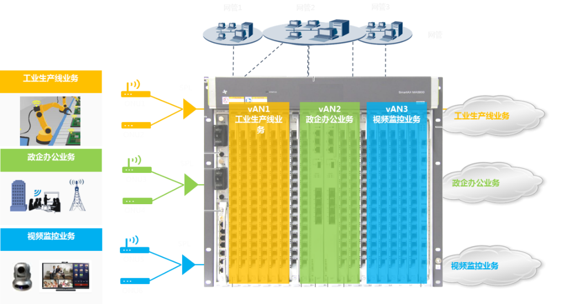 面對(duì)各類業(yè)務(wù)對(duì)于網(wǎng)絡(luò)資源能力需求、分權(quán)分域管理、安全隔離等必要的要求,工業(yè)PON OLT設(shè)備具備切片能力,一個(gè)物理OLT可以虛擬為多個(gè)OLT分片,分別承載各類業(yè)務(wù),實(shí)現(xiàn)獨(dú)立運(yùn)維管理,業(yè)務(wù)和網(wǎng)絡(luò)資源互不干擾,可以有效實(shí)現(xiàn)可靠性、安全性、網(wǎng)絡(luò)資源三者之間的平衡。
