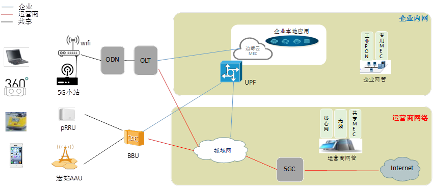 工廠內(nèi)網(wǎng)絡(luò)可以細(xì)分為企業(yè)內(nèi)網(wǎng)和運(yùn)營(yíng)商網(wǎng)絡(luò)。企業(yè)內(nèi)網(wǎng)可以部署下沉UPF+MEC,起到業(yè)務(wù)分流、降低時(shí)延、數(shù)據(jù)不出廠的作用。辦公類數(shù)據(jù)可以經(jīng)城域網(wǎng)進(jìn)入運(yùn)營(yíng)商外網(wǎng)。企業(yè)內(nèi)的5G無(wú)線部署可以多種方式相結(jié)合,包括宏站、皮站、室分、一體化小基站等。對(duì)于運(yùn)營(yíng)商外網(wǎng),需要考慮如何把小基站的數(shù)據(jù)經(jīng)由PON回傳后分流至5GC。對(duì)于宏站,也可以考慮采用工業(yè)PON作為回傳,只用于BBU下沉工廠內(nèi)的情況,BBU如果放在電信機(jī)房,則無(wú)需通過(guò)工業(yè)PON回傳。對(duì)于企業(yè)內(nèi)網(wǎng),根據(jù)企業(yè)業(yè)務(wù)的不同,可能需要部署MEC,將部分WiFi、5G小基站、宏站的流量分流到工廠內(nèi)部。