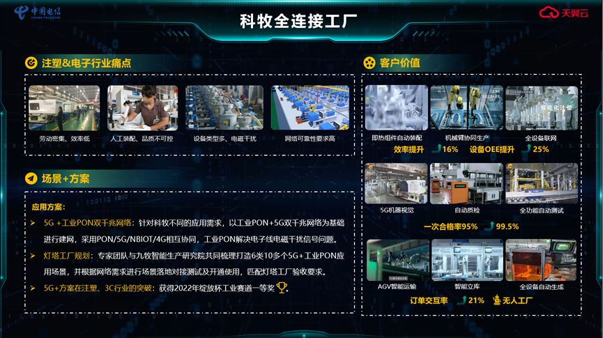 在全連接工廠展區,中國電信在智慧工業、智慧能源、智慧農業、智慧車聯網等領域傾心培育的合作成果也將悉數展出。其中,科牧5G全連接工廠打造了全國首個注塑電子行業5G全連接應用標桿,落地了9類“30+”5G+工業互聯網應用場景,實現了1500多個設備終端接入;中核智慧工廠以5G專網、千兆光網建設全連接工廠基礎設施,打造了5G智慧工廠先進制造業基地,實現多項業務應用創新,達成中核科技集團內部信息流拉通,實現全方位達成數據要素和涉密信息的立體安全保障機制,完成了數字化全連接工廠架構的搭建;烽火千兆工廠項目分別以終端側、網絡側和邊緣云提供協同的整體解決方案;針對電網“三高一低”的典型特征,中國電信5G賦能虛擬電廠應用場景,將改變傳統電網“源隨荷動”發展模式為“源荷互動”發展新模式;而中國電信5G礦山將物聯網、云計算、人工智能等技術與現代露天礦山開發技術深度融合,形成具有礦山全面感知、實時互聯、協同控制等功能的5G智慧礦山系統;星火有機硅案例(包含10余項工業應用場景)以5G MEC打通企業工業內外網的安全可靠連接,通過5G工業網關、智能手環、5G攝像頭、5G無人機等實現對工廠人、機、物的數據采集,在此基礎上提供“增加大數據應用構建全新全要素的數字孿生工廠”的解決方案;中國電信5G在光伏行業的應用能力和實踐旨在通過5G+工業互聯網融合創新實現5G全連接數字工廠的目標,構建太陽能云平臺生態圈,借助5G+MEC、工業互聯網、云計算(AI)、大數據、機器視覺等先進技術實現對光伏產品智能制造及光伏電站運維的“人機料法環測”等環節的管控;上汽行業云則以打造一朵安全可信的云、一張跨域信息網、一個行業通用數據平臺、一組汽車SaaS應用、一個汽車服務生態圈,共同為上汽超過300家生態鏈企業提供云網服務及安全運營服務,有力支持上汽集團“電動化、網聯化、智能化、共享化”新四化戰略轉型、引領中國汽車行業科技創新;智慧糧食云平臺實現了平臺、庫點和農戶的多級管理與系統的互連互通,以及“點、線、面”全方位遠程監管。