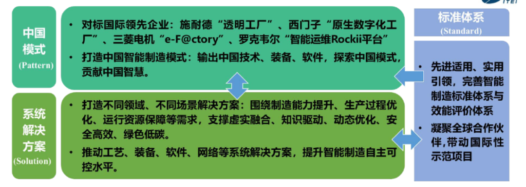 如圖4所示,要對智能制造成果和主要模式進行系統梳理和凝煉,我國應善于高質量總結提出自己的制造模式、自主供給的系統解決方案;在此基礎上用標準化的方法進一步固化承載這些模式和解決方案。新時期我們推進智能制造,可以高度概括為“以特色模式為總體輸出,以解決方案為技術裝備支撐,以標準體系為凝練載體”