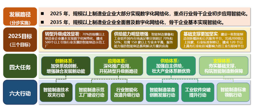 《“十四五”智能制造發展規劃》明確提出要以制造為本質,緊扣智能特征;以工藝、裝備為核心,以數據為基礎;依托制造單元、車間、工廠、供應鏈等載體,構建虛實融合、知識驅動、動態優化、安全高效、綠色低碳的智能制造系統。具體包括了四大任務、六大行動(如圖2 所示):