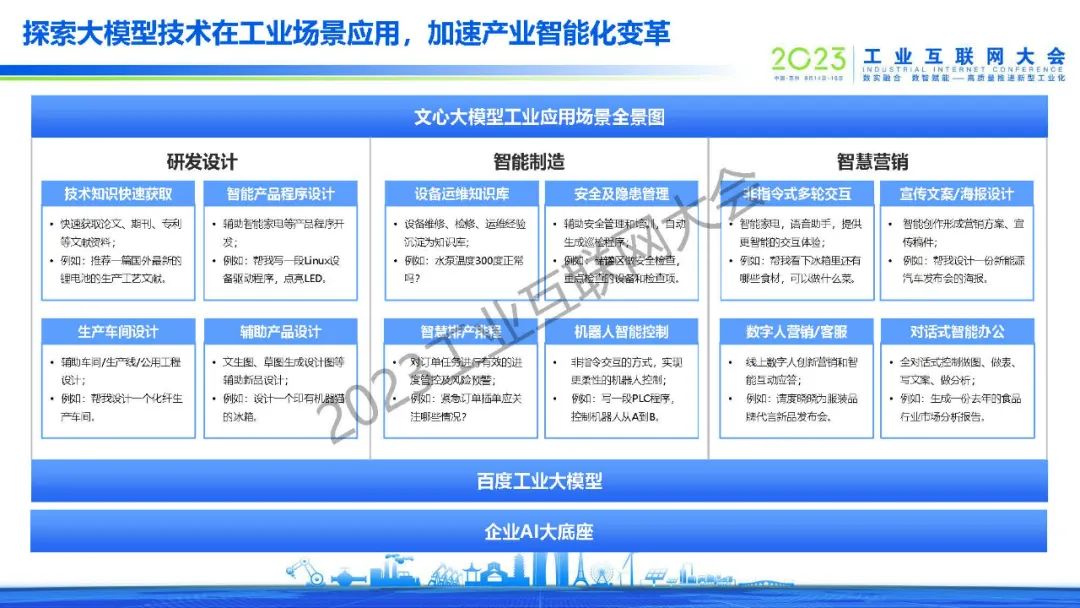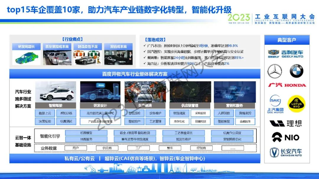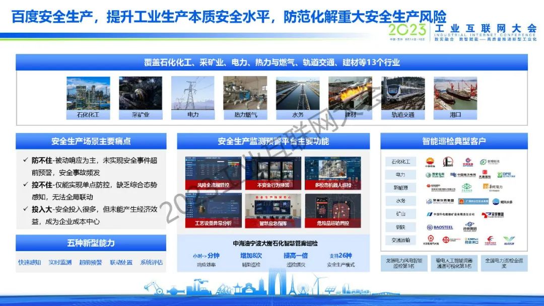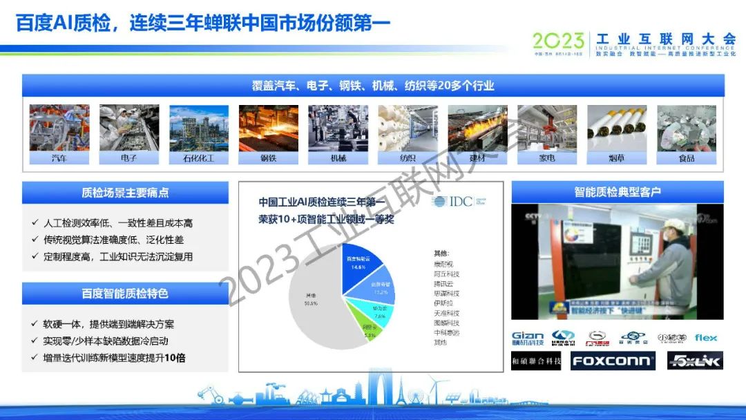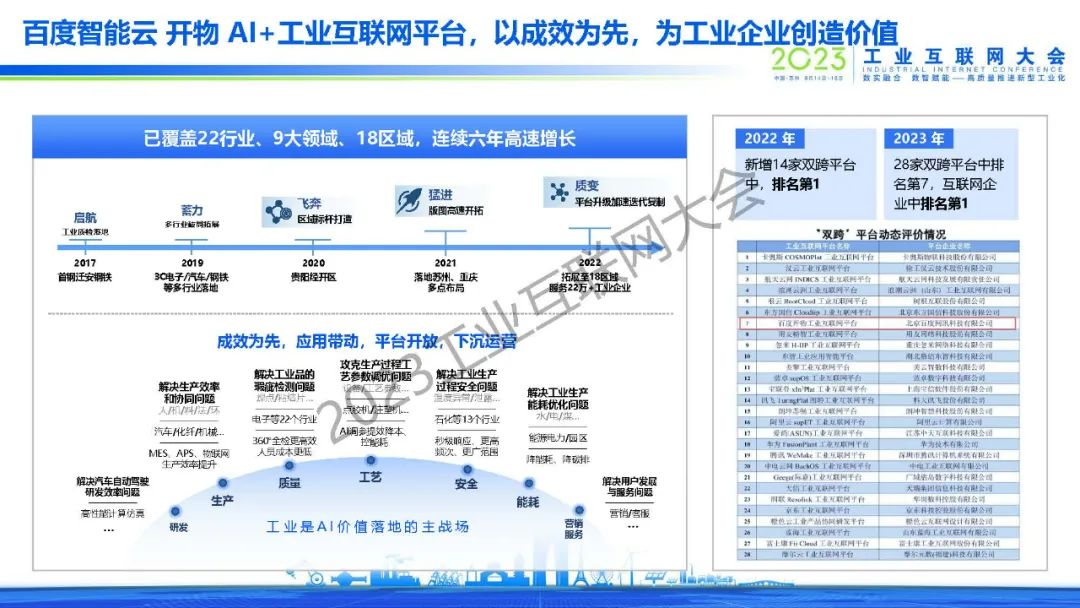 黃鋒表示,百度從2017年單一的AI質(zhì)檢場景開始,逐漸拓展到安全生產(chǎn)、能耗優(yōu)化、智能調(diào)度等場景,在生產(chǎn)、銷售、客戶服務(wù)、供應(yīng)鏈等環(huán)節(jié)都做了大量成功案例,同時從行業(yè)拓展到區(qū)域,和地方政府共建了多個工業(yè)互聯(lián)網(wǎng)產(chǎn)業(yè)基地,批量賦能當(dāng)?shù)禺a(chǎn)業(yè)和客戶企業(yè)。2017年到今天,百度開物工業(yè)互聯(lián)網(wǎng)實現(xiàn)了規(guī)?;鲩L,同時也得到了工信部的認(rèn)可,在2022年評為新增14家雙跨平臺第一名,2023年在所有互聯(lián)網(wǎng)企業(yè)中排名第一。未來也將繼續(xù)探索大模型技術(shù)在工業(yè)場景應(yīng)用,將自身沉淀出的工業(yè)AI技術(shù)沉淀為平臺,和行業(yè)合作伙伴一同賦能客戶、產(chǎn)生價值,為工業(yè)互聯(lián)網(wǎng)的發(fā)展盡自己的一份力量。