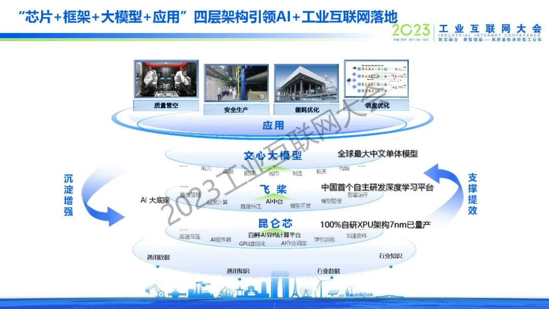 “從數(shù)據(jù)中挖掘出工業(yè)知識,并在應(yīng)用中真正產(chǎn)生降本增效的價值,才是工業(yè)互聯(lián)網(wǎng)未來發(fā)展的趨勢,從數(shù)據(jù)中挖掘知識就是AI擅長的事。百度從2017年開始探索AI與工業(yè)互聯(lián)網(wǎng)的融合,秉承著“成效為先,應(yīng)用帶動,平臺開放,下沉運營”的發(fā)展理念,通過自主研發(fā)的“芯片+框架+大模型+應(yīng)用”四層架構(gòu),引領(lǐng)AI+工業(yè)互聯(lián)網(wǎng)在各個場景的落地?!?/p>