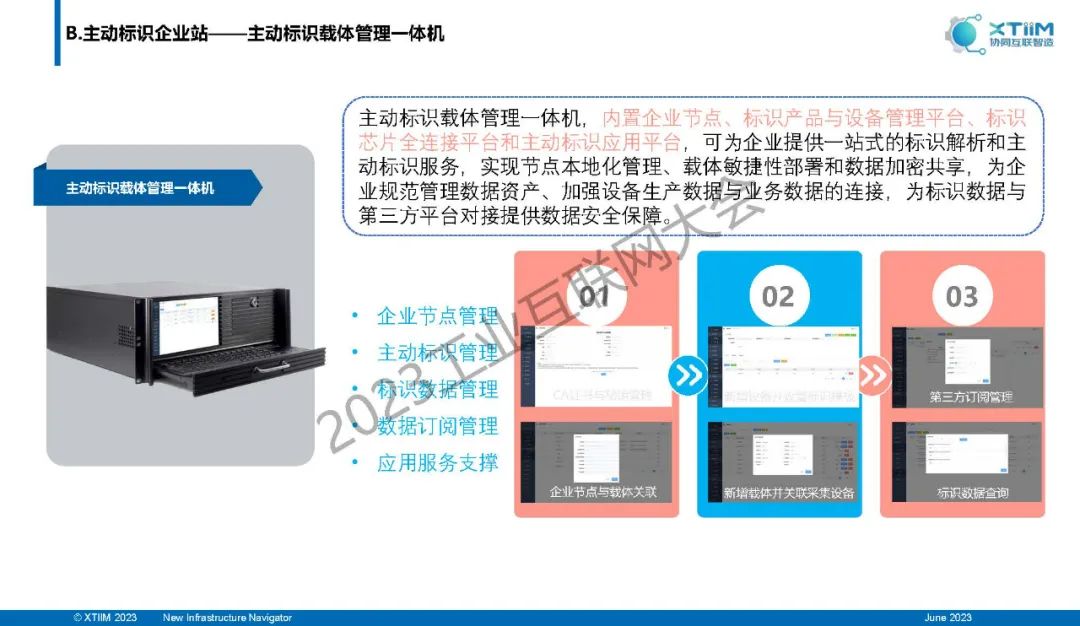 “主動標(biāo)識載體管理一體機,內(nèi)置企業(yè)節(jié)點、標(biāo)識產(chǎn)品與設(shè)備管理平臺、標(biāo)識芯片全連接平臺和主動標(biāo)識應(yīng)用平臺,可為企業(yè)提供一站式的標(biāo)識解析和主動標(biāo)識服務(wù),實現(xiàn)節(jié)點本地化管理、載體敏捷性部署和數(shù)據(jù)加密共享,為企業(yè)規(guī)范管理數(shù)據(jù)資產(chǎn)、加強設(shè)備生產(chǎn)數(shù)據(jù)與業(yè)務(wù)數(shù)據(jù)的連接,為標(biāo)識數(shù)據(jù)與第三方平臺對接提供數(shù)據(jù)安全保障。”