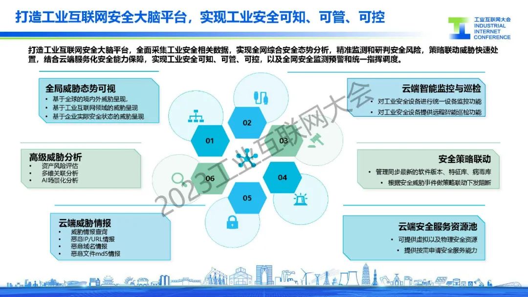 曹東介紹,需要構(gòu)建安全防護(hù)體系、監(jiān)測(cè)體系、處置體系、保障體系,實(shí)現(xiàn)最小干擾、深度防護(hù)的工業(yè)數(shù)字化安全。通過(guò)打造工業(yè)互聯(lián)網(wǎng)安全大腦平臺(tái),全面采集工業(yè)安全相關(guān)數(shù)據(jù),實(shí)現(xiàn)全網(wǎng)綜合安全態(tài)勢(shì)分析,精準(zhǔn)監(jiān)測(cè)和研判安全風(fēng)險(xiǎn),策略聯(lián)動(dòng)威脅快速處置,結(jié)合云端服務(wù)化安全能力保障,實(shí)現(xiàn)工業(yè)安全可知、可管、可控,以及全網(wǎng)安全監(jiān)測(cè)預(yù)警和統(tǒng)一指揮調(diào)度。