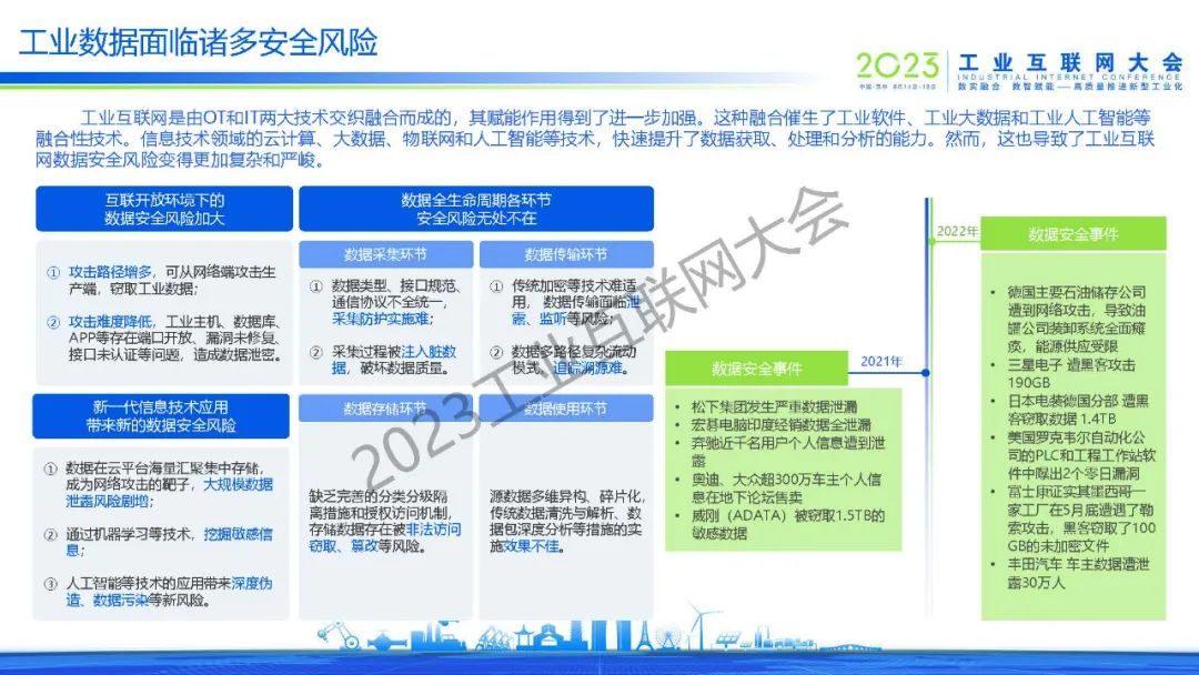 王亭景介紹,工業(yè)互聯(lián)網(wǎng)是由OT和IT兩大技術(shù)交織融合而成的,其賦能作用得到了進(jìn)一步加強(qiáng)。這種融合催生了工業(yè)軟件、工業(yè)大數(shù)據(jù)和工業(yè)人工智能等融合性技術(shù)。信息技術(shù)領(lǐng)域的云計(jì)算、大數(shù)據(jù)、物聯(lián)網(wǎng)和人工智能等技術(shù),快速提升了數(shù)據(jù)獲取、處理和分析的能力。然而,這也導(dǎo)致了工業(yè)互聯(lián)網(wǎng)數(shù)據(jù)安全風(fēng)險(xiǎn)變得更加復(fù)雜和嚴(yán)峻。
