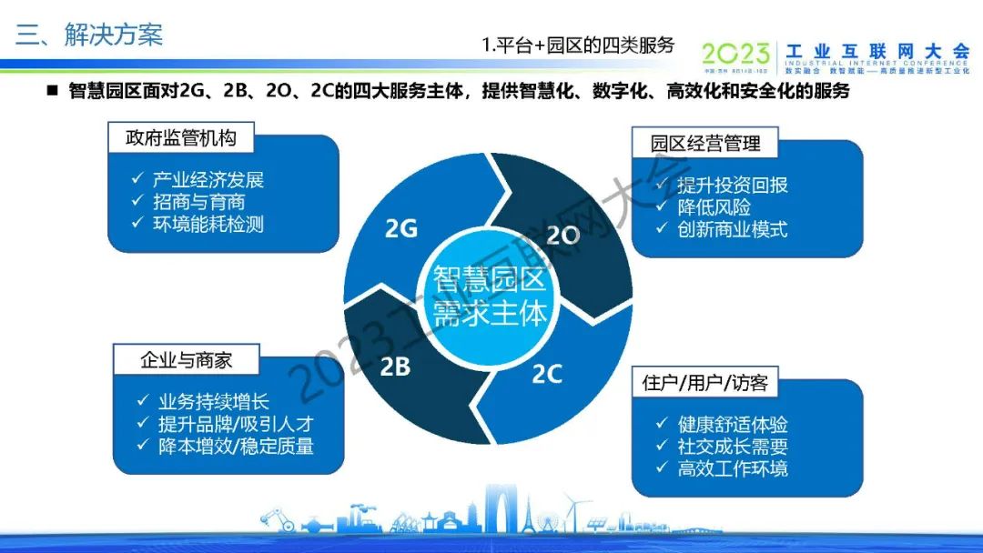 “智慧園區面對2G、2B、2O、2C的四大服務主體,提供智慧化、數字化、高效化和安全化的服務。“