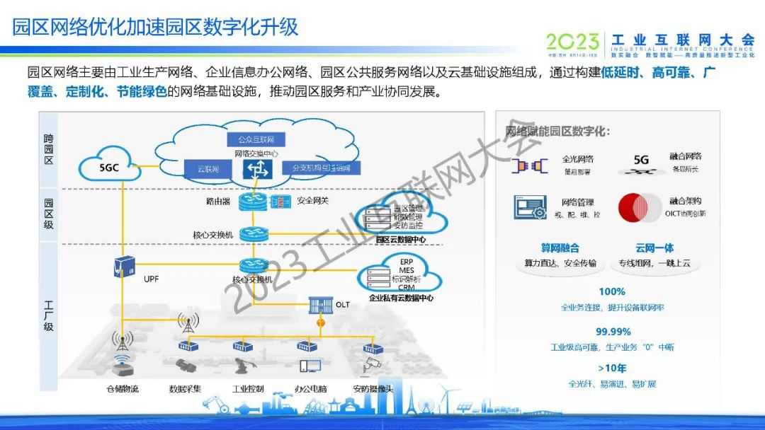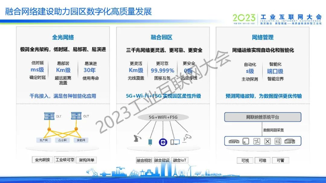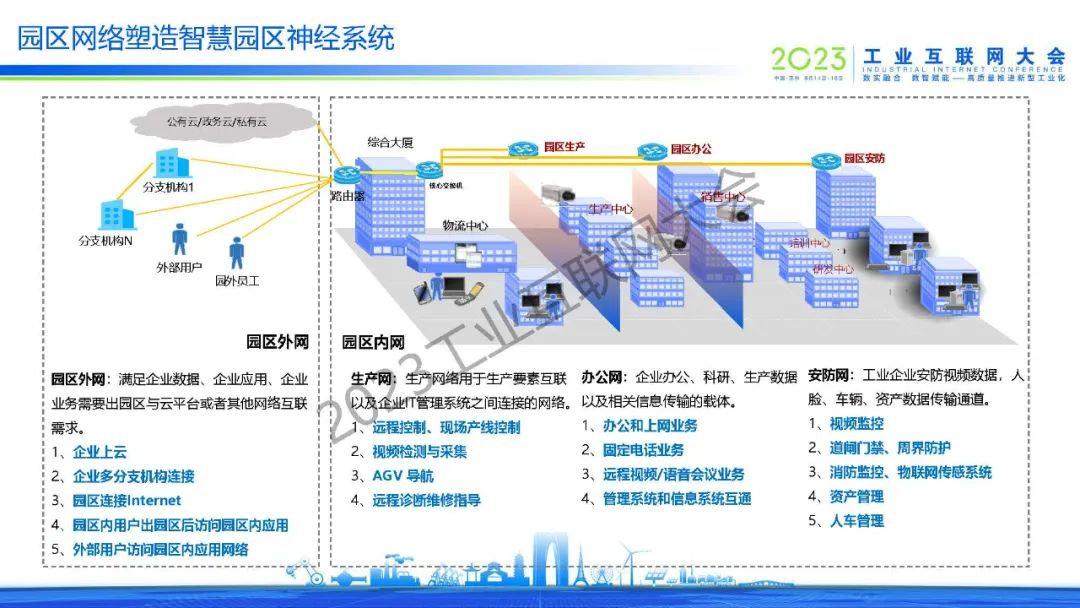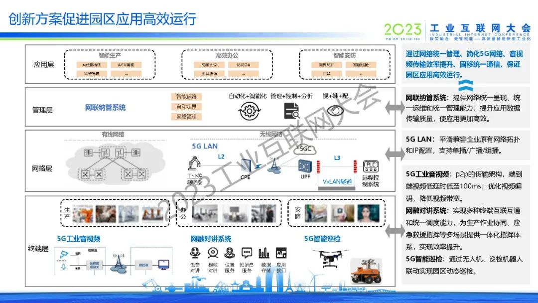 王常玲介紹,園區(qū)網(wǎng)絡(luò)主要由工業(yè)生產(chǎn)網(wǎng)絡(luò)、企業(yè)信息辦公網(wǎng)絡(luò)、園區(qū)公共服務(wù)網(wǎng)絡(luò)以及云基礎(chǔ)設(shè)施組成,通過構(gòu)建低延時、高可靠、廣覆蓋、定制化、節(jié)能綠色的網(wǎng)絡(luò)基礎(chǔ)設(shè)施,推動園區(qū)服務(wù)和產(chǎn)業(yè)協(xié)同發(fā)展。融合網(wǎng)絡(luò)全面接入園區(qū)設(shè)備,實現(xiàn)設(shè)施網(wǎng)絡(luò)化、管理精細化、服務(wù)功能專業(yè)化。