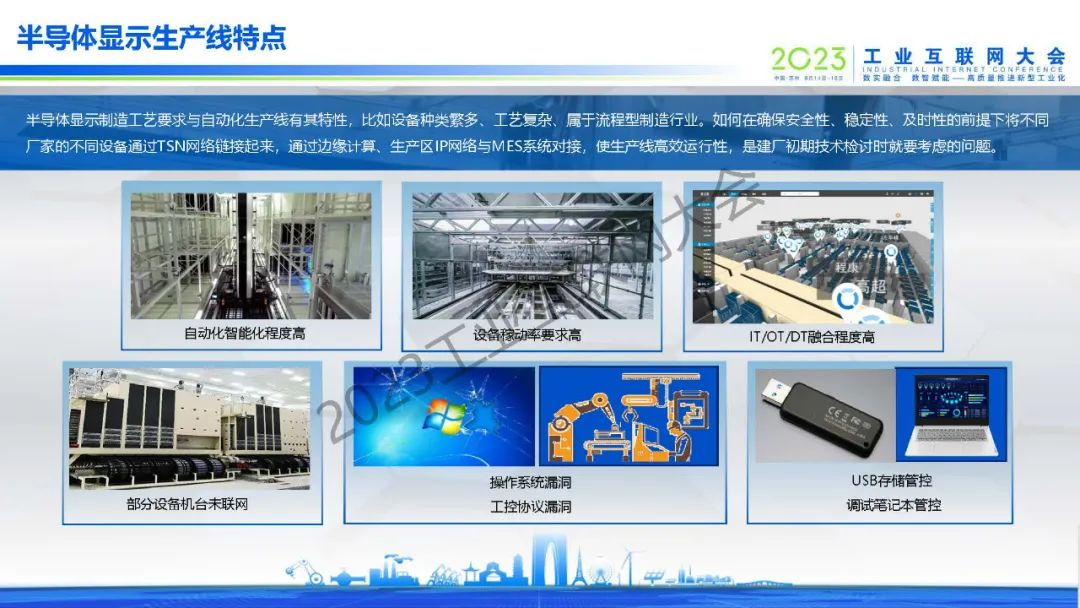 “半導體顯示制造工藝要求與自動化生產線有其特性,比如設備種類繁多、工藝復雜、屬于流程型制造行業。如何在確保安全性、穩定性、及時性的前提下將不同廠家的不同設備通過TSN網絡鏈接起來,通過邊緣計算、生產區IP網絡與MES系統對接,使生產線高效運行性,是建廠初期技術檢討時就要考慮的問題。